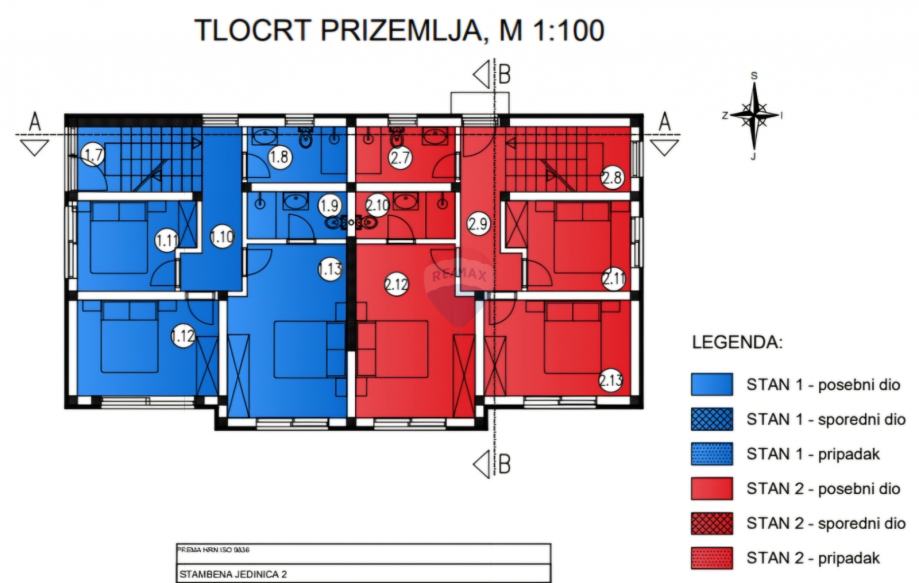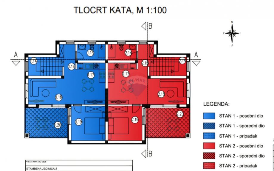Kući pripadaju dva parkirna mjesta, P3 i P4, u etažnom elaboratu označena crvenom bojom.