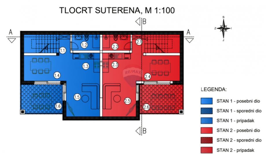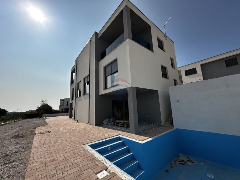 Prodaje se luksuzna dvojna kuća S2 s bazenom i velikim dvorištem u Vodicama. Kuća se proteže na tri etaže koje čine suteren, prizemlje i kat. U suterenu se nalazi kuhinja spojena s blagovaonicom i dnevnim boravkom, kupaonica te natkrivena terasa površine 11.63m2.