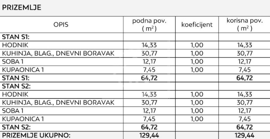 Sastoji se od prizemlja i kata. Prizemlje sadrži: hodnik (pov. 14.33 m2), dnevni boravak s kuhinjom i blagovaonicom (pov. 30.77 m2), spavaću sobu (pov. 12,17 m2) i kupaonicu (pov. 7.45 m2). Unutrašnjim stubištem dolazi se na 1. kat koji sadrži: hodnik (pov. 13.62 m2), tri spavaće sobe (pov. 10.38 m2, 12.73 m2 i 13.06 m2), dvije kupaonice (pov. 4.94 m2 i 3.60 m2), te dvije nenatkrivene terase (pov. 11.82 m2 i 4.35 m2). Jedna spavaća soba ima svoju kupaonicu. Spiralnim unutrašnjim stubištem dolazi se na krovnu terasu koja sadrži: nenatkrivenu terasu (pov. 31.56 m2) i natkrivenu terasu (pov. 2.77 m2). Na krovnoj terasi nalazit će se bazan koji će biti uređen i pripremljen za uporabu (s grijanjem) dimenzija 450 x 300 cm.