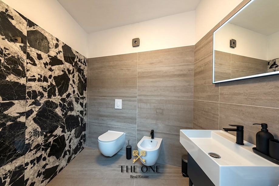 Unutarnje stepenice vode vas do prostrane garaže i kotlovnice ili do gornje etaže gdje se nalaze tri udobne spavaće sobe. Jedna od njih je 'master' soba koja dolazi s vlastitim luksuznim kupatilom i prostranim walk-in ormarom, pružajući vam potpuni komfor i privatnost. Na katu se nalazi i dodatno, veće kupatilo, te terasa zapadne orijentacije s prekrasnim pogledom na more i zelenilo.