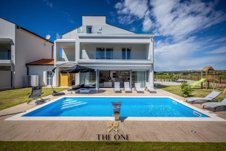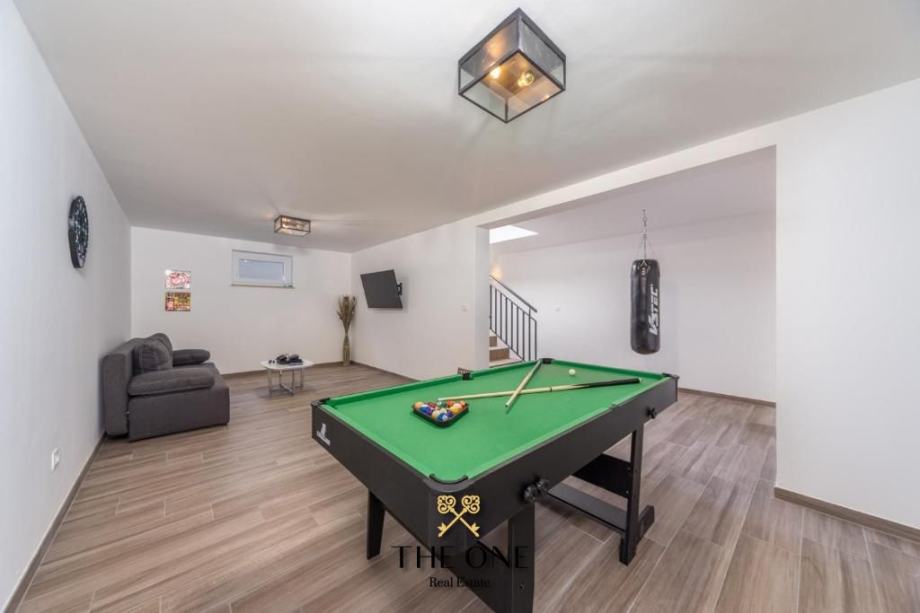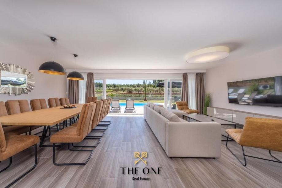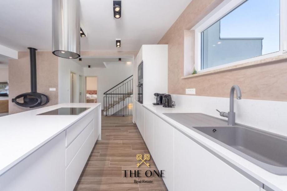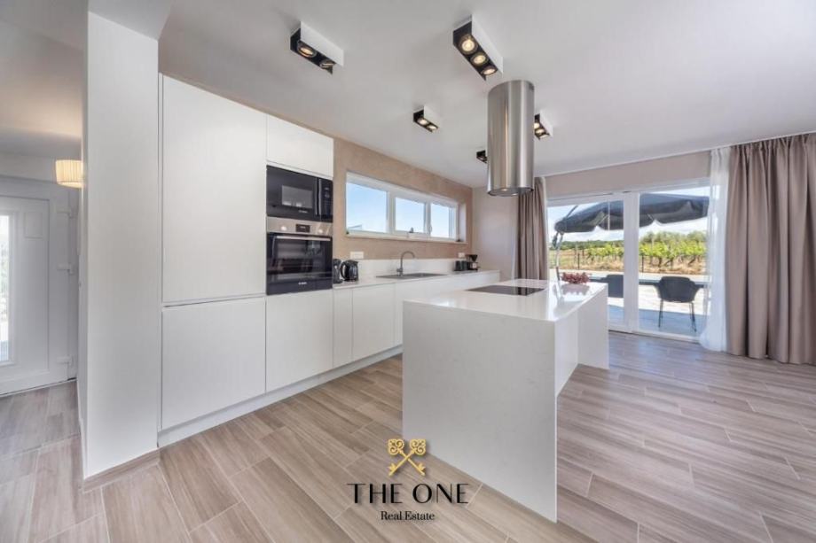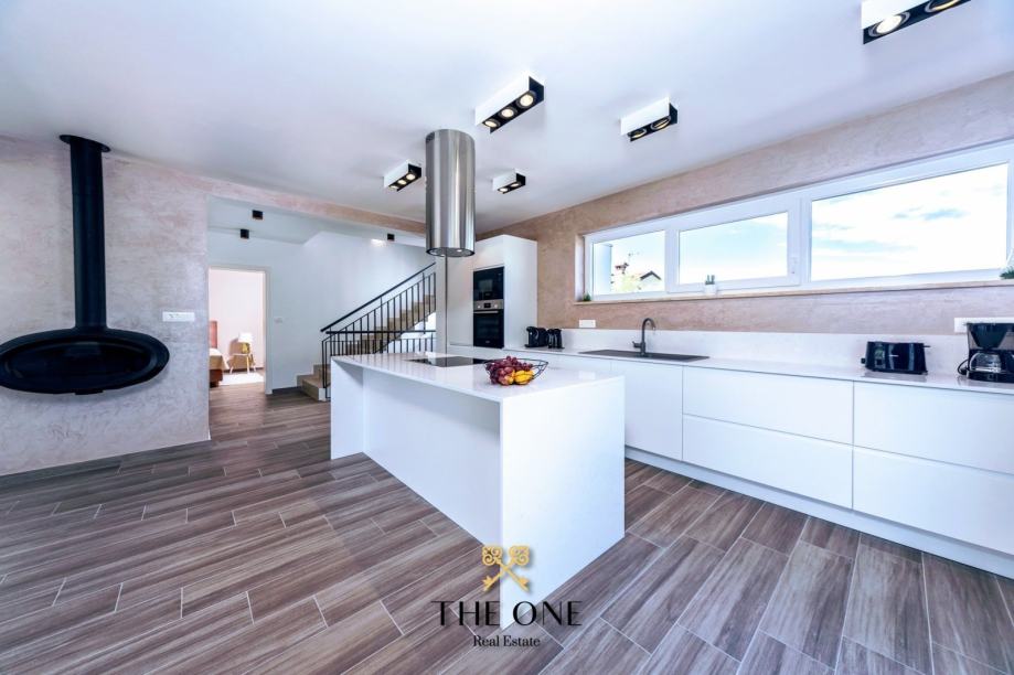 Vila se nalazi u prekrasnom području s panoramskim pogledom na okolicu. Proteže se na tri etaže. Prizemljem dominira veliki prostor otvorenog koncepta koji se sastoji od moderno dizajnirane kuhinje upotpunjene blagovaonicom s velikim stolom i prostranim dnevnim boravkom. Cjelokupni dnevni dio vile izuzetno je svijetao za što su zaslužne pastelne boje koje prevladavaju u interijeru kao i velika staklena stijena cijelom dužinom. Staklena vrata povezuju interijer s eksterijerom, nudeći otvoreni pogled na vrt.