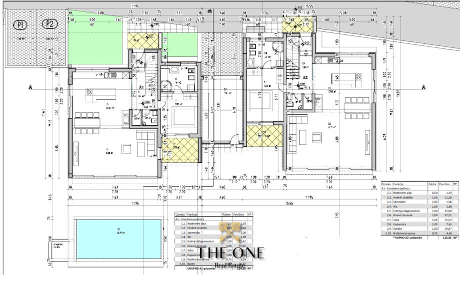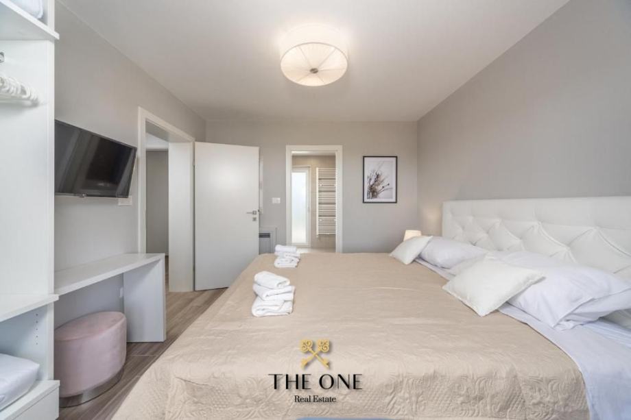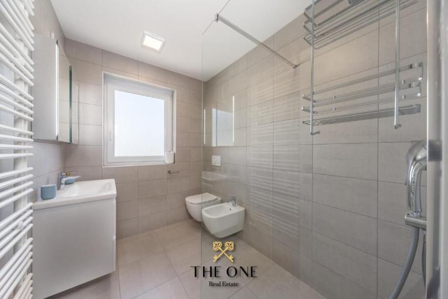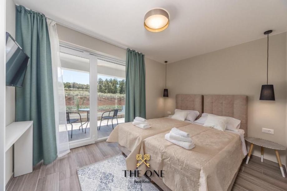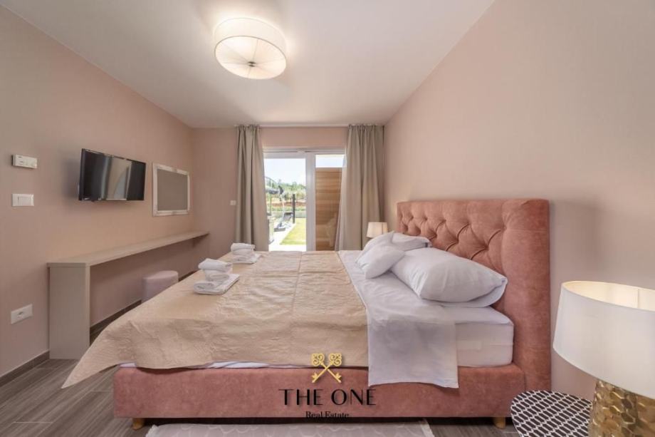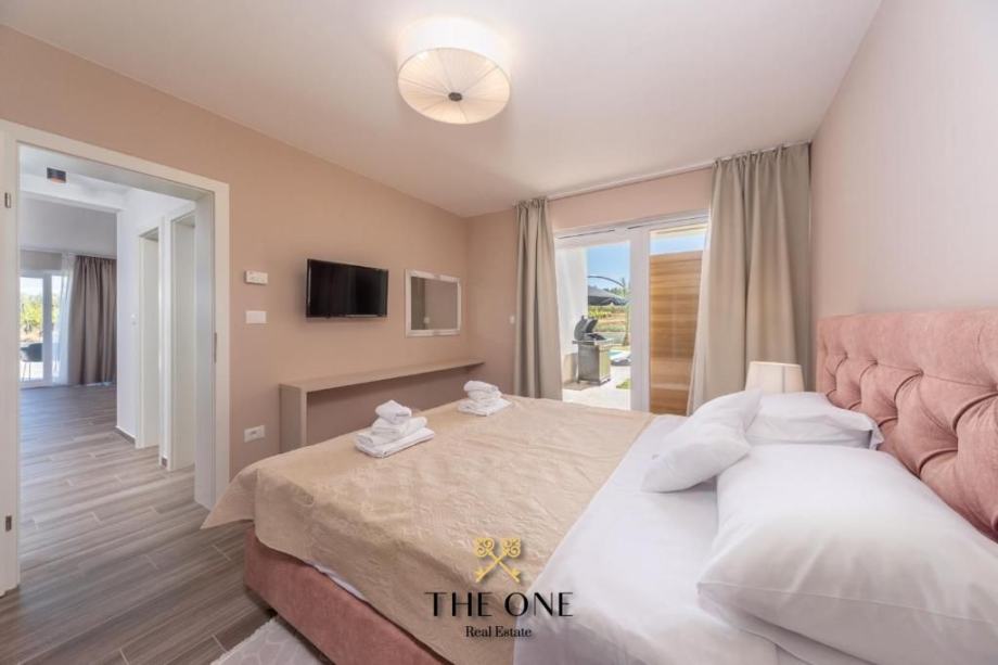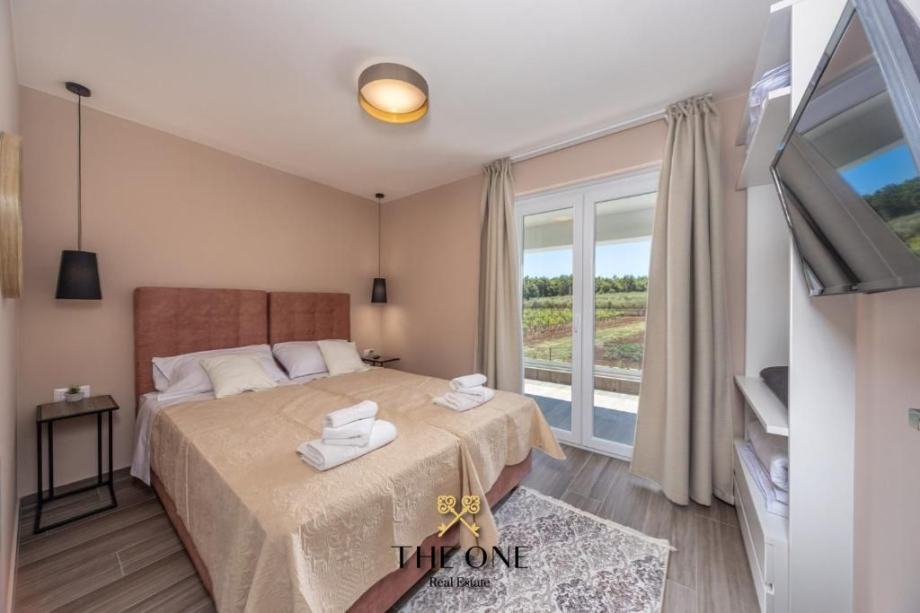 Vila se nalazi u prekrasnom području s panoramskim pogledom na okolicu. Proteže se na tri etaže. Prizemljem dominira veliki prostor otvorenog koncepta koji se sastoji od moderno dizajnirane kuhinje upotpunjene blagovaonicom s velikim stolom i prostranim dnevnim boravkom. Cjelokupni dnevni dio vile izuzetno je svijetao za što su zaslužne pastelne boje koje prevladavaju u interijeru kao i velika staklena stijena cijelom dužinom. Staklena vrata povezuju interijer s eksterijerom, nudeći otvoreni pogled na vrt.
