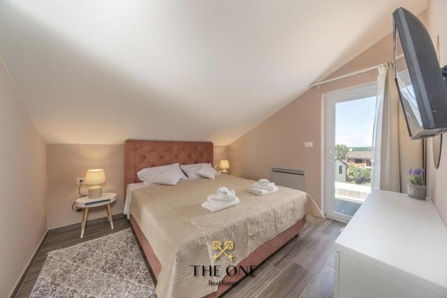 Stubište vodi na prvi kat vile gdje se nalaze četiri spavaće sobe. Jedna spavaća soba ima kupatilo, te dvije natkrivene terase sa otvorenim pogledom na okolicu. Dvije spavaće sobe također imaju izlaz na prekrasnu terasu. Na istom katu nalazi se kupaonica. U potkrovlju se nalazi jedna spavaća soba, kupaonica i ostava.