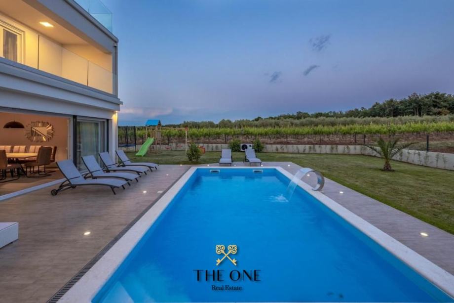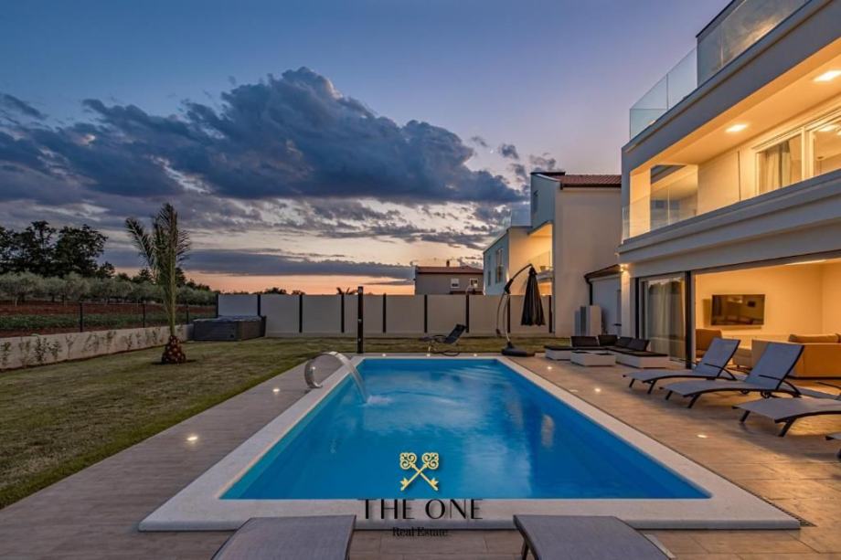 Vanjski prostor savršeno nadopunjuje interijer. Na terasi se nalazi lounge dio, sauna, jacuzzi te grijani bazen okružen sunčalištem. Kultivirani vrt u potpunosti okružuje terasu i bazen, a na njemu se nalazi i dječje igralište.