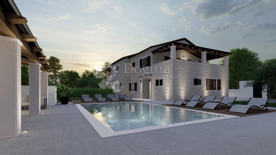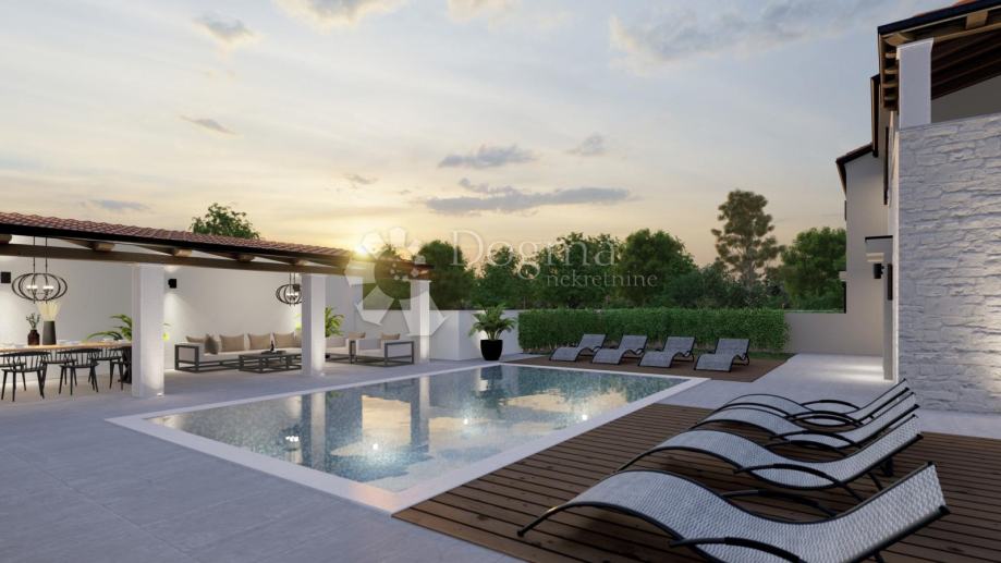 Na udaljenosti od par kilometara do centra zbivanja i brojnih plaža, nalazi se predivna dvojna vila površine 170 m2 sa bazenom od 24 m2 i uređenom okućnicom. Smještena je na kraju naselja te je kao takva zadnja u nizu građevinskog pojasa sa pogledom na zelenilo. Osigurana su dva parkirna mjesta u kompletno ograđenom dvorištu koje pruža privatnost. Na kamenom dijelu fasade planirana je vanjska rasvjeta te ljetna kuhinja koje osiguravaju maksimalnu iskoristivost okućnice kroz čitav dan.
