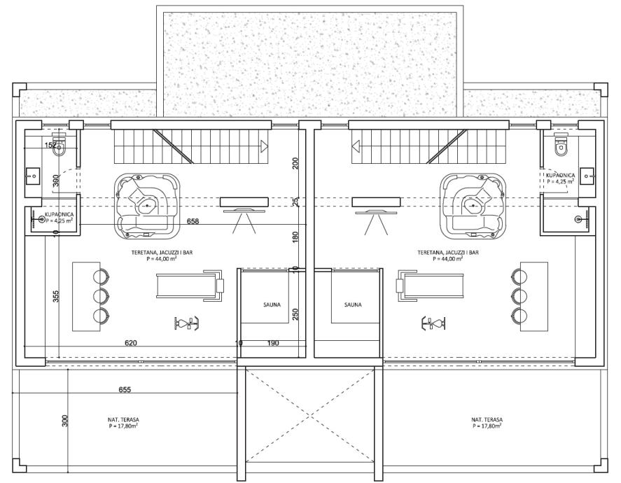 Zadnja etaža predviđena je za hang-out zonu te sadrži bar, jacuzzi, teretanu, saunu i kupaonicu te natkrivenu terasu.