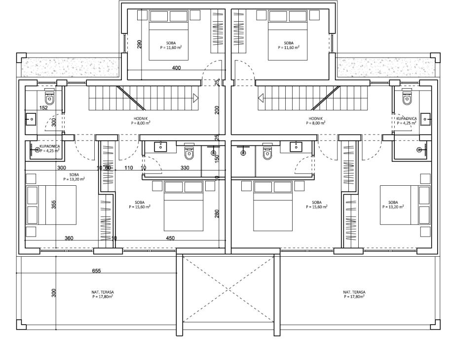 Na prvom katu su 3 spavaće sobe – od kojih je jedna sa vlastitom kupaonicom te dodatna kupaonica, predsoblje i natkrivena terasa.
