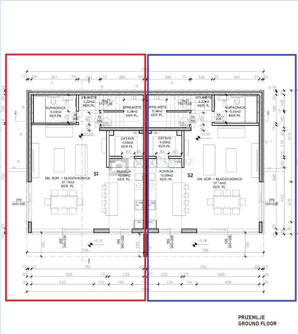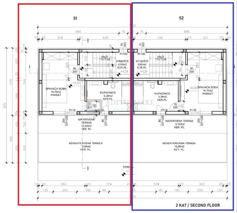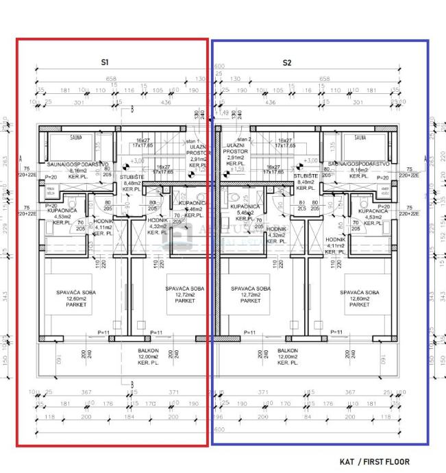 Svaka stambena jedinica ima 223m2 i sastoji se od tri etaže : prizemlje +kat + 2 kat .
