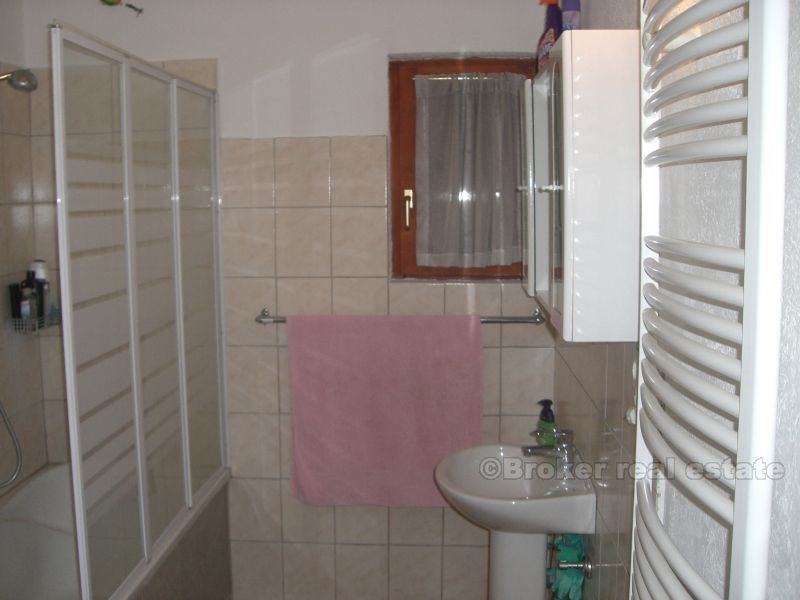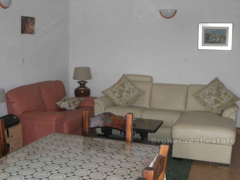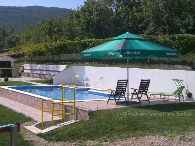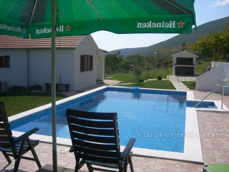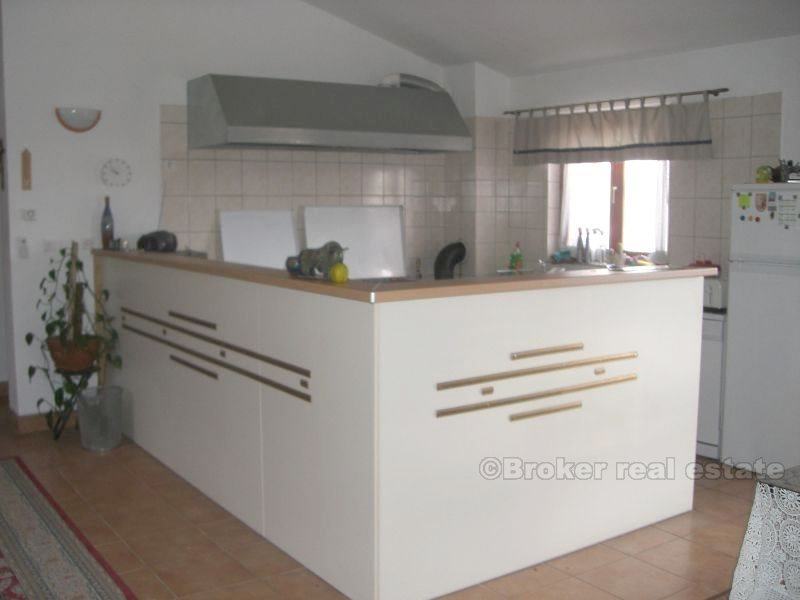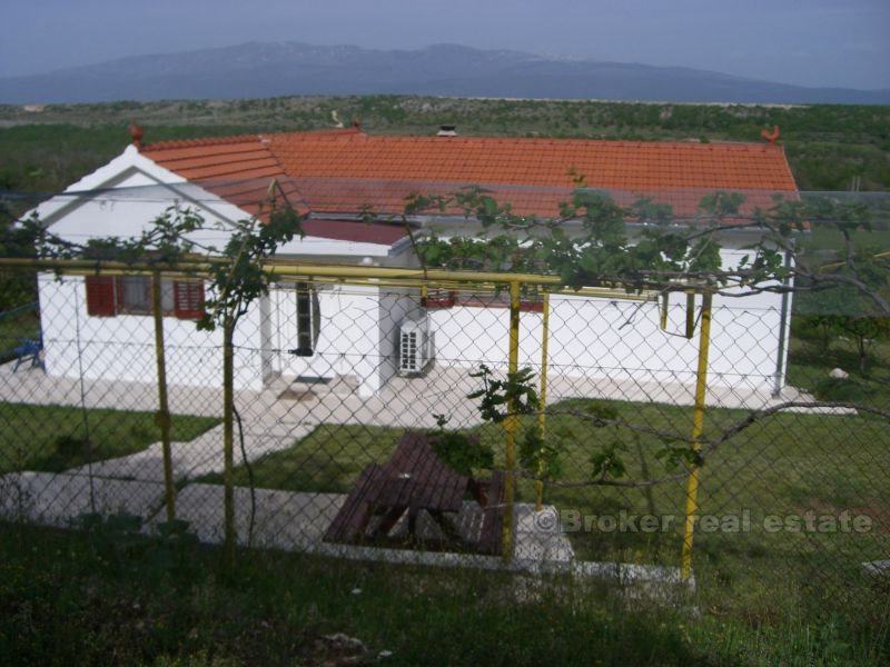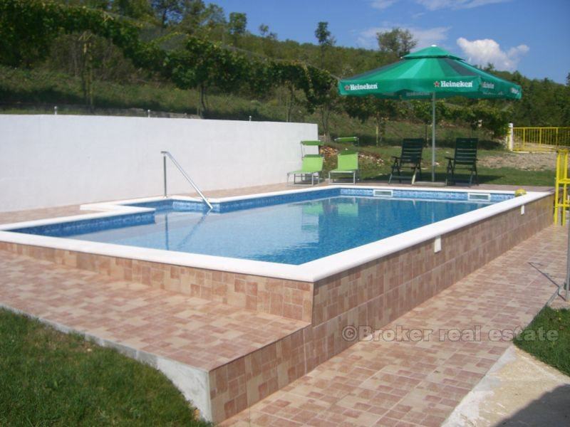 Kuća je 160 m2, 2 sobe i 2 kupaone, kuhinja, dnevni boravak, blagovaona, garaža (32 m2), konoba (20 m2). Na zemljištu se nalazi bazen (32 m2).