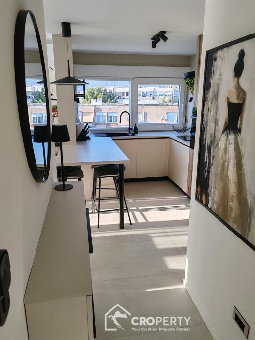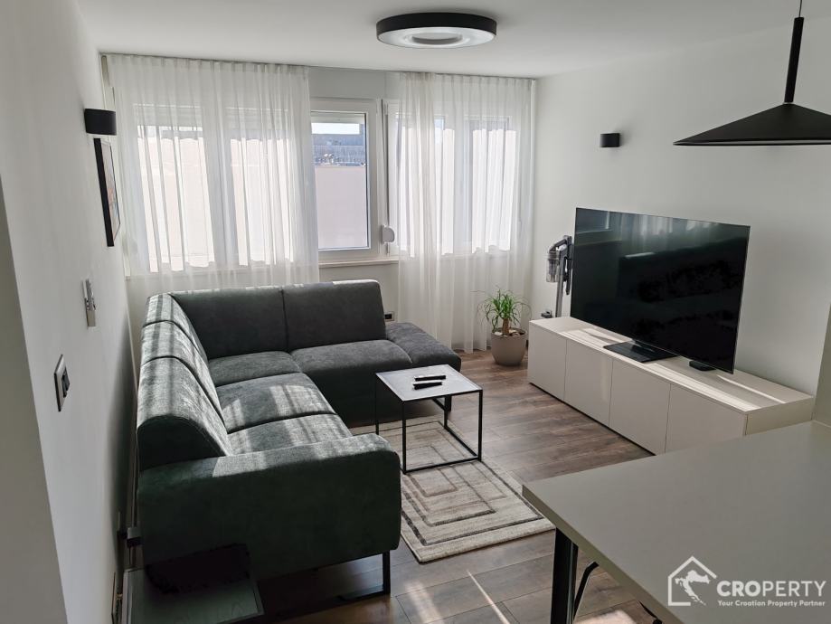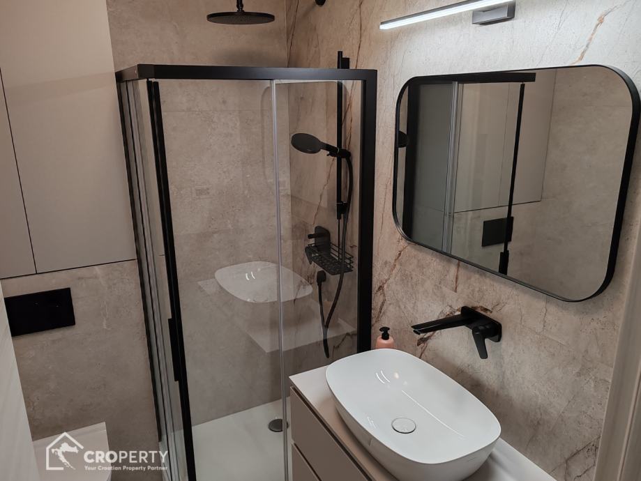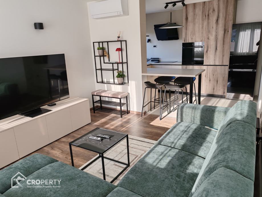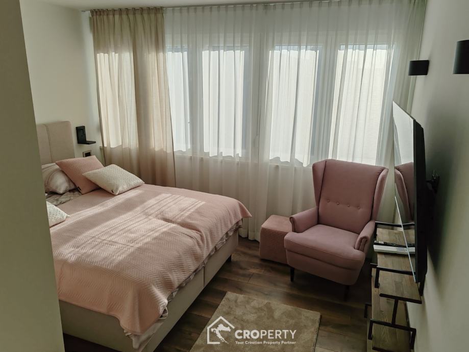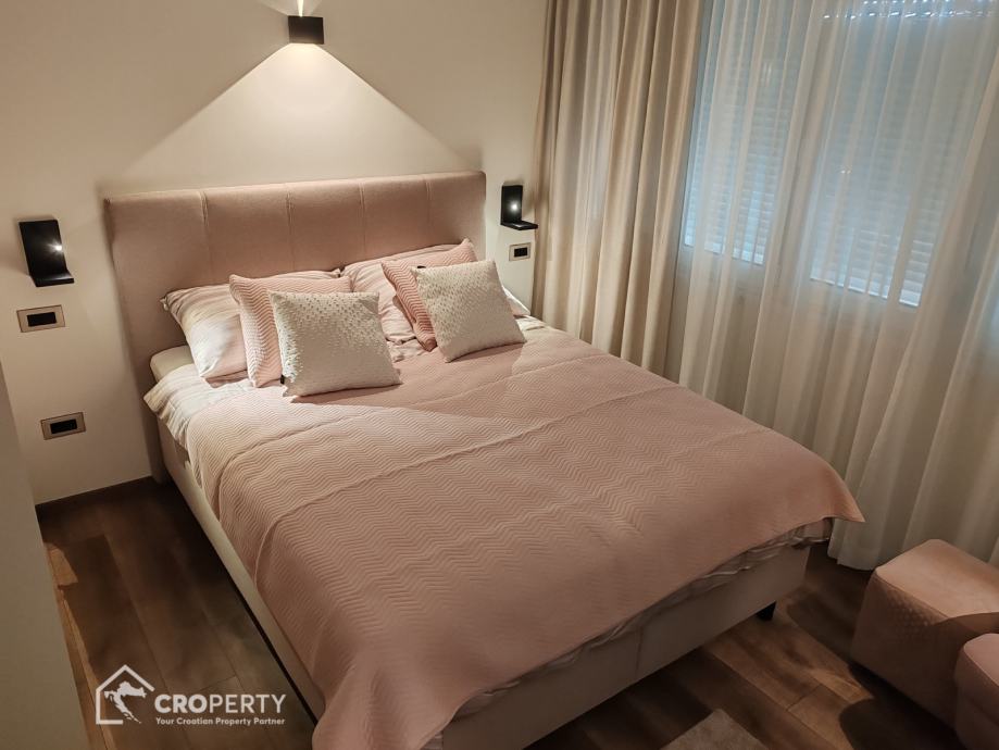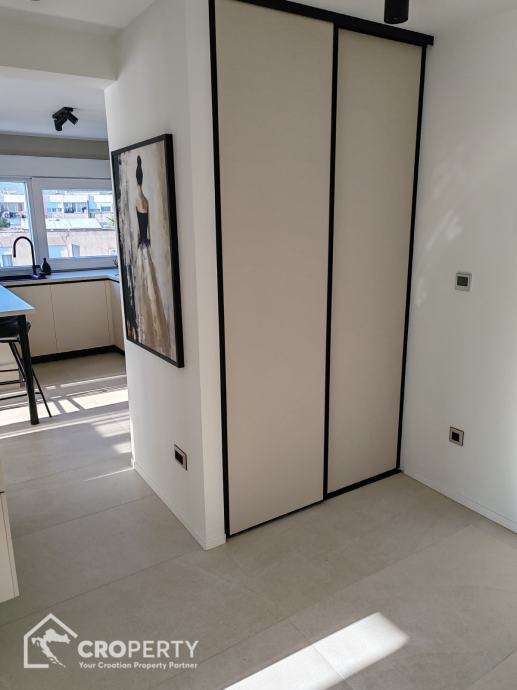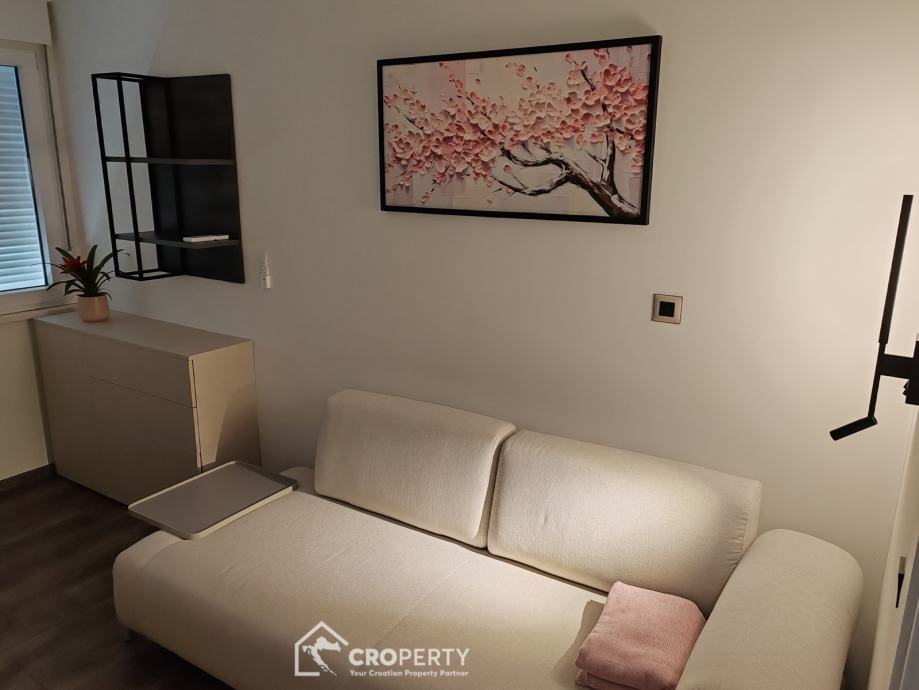 Unutrašnjost odiše suvremenim stilom – od vrhunske keramike i sanitarija, do moderne rasvjete i namještaja rađenog po mjeri. Stan se sastoji od spavaće i radne sobe, prostranog dnevnog boravka s kuhinjom i blagovaonicom, te kupaonice s walk-in tušem.