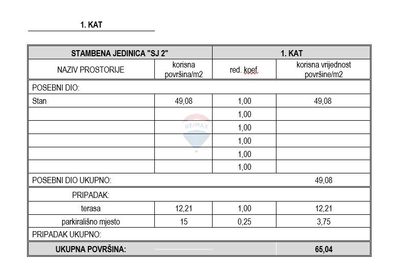Apartman ima 65.04 m2 i sastoji se od hodnika, wc/kupaonice, dvije spavaće sobe, kuhinje, blagovaonice i dnevnog boravka u jednom prostoru te terase od 12,21 m2. Pripada mu jedno parkirno mjesto.