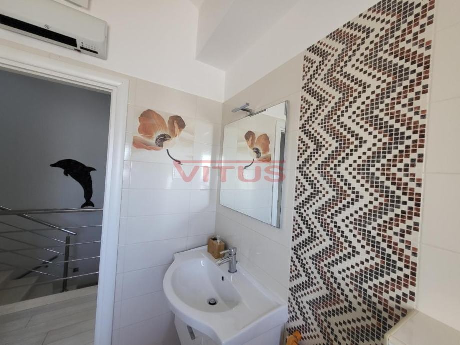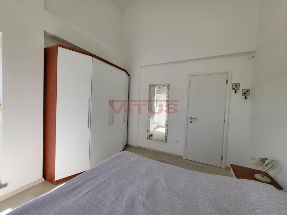 Samo u našoj ponudi!! Apartman površine 75 m2 nalazi se na drugom katu apartmanske zgrade u Njivicama. Sastoji se od dnevnog boravka sa kuhinjom i blagovaonicom, dvije spavaće sobe, dvije kupaonice i terase sa prekrasnim, panoramskim pogledom na more. Apartmanu također pripada i okućnica od 44,50 m2 i jedno parkirno mjesto, potpuno je klimatiziran te se prodaje namješten. Odlična nekretnina na super lokaciji, samo 350 m od mora!