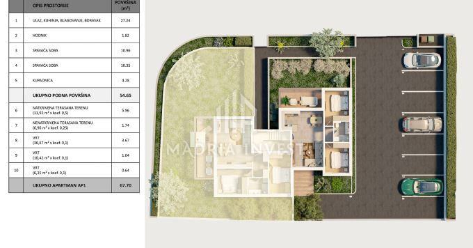 Stanovima pripada i spremište u podrumu zgrade. Svi apartmani su dvosobni, površine između 55 i 83 m², te imaju prostrane terase veličine 10 do 15 m². Apartmani u prizemlju dodatno raspolažu privatnim vrtovima.