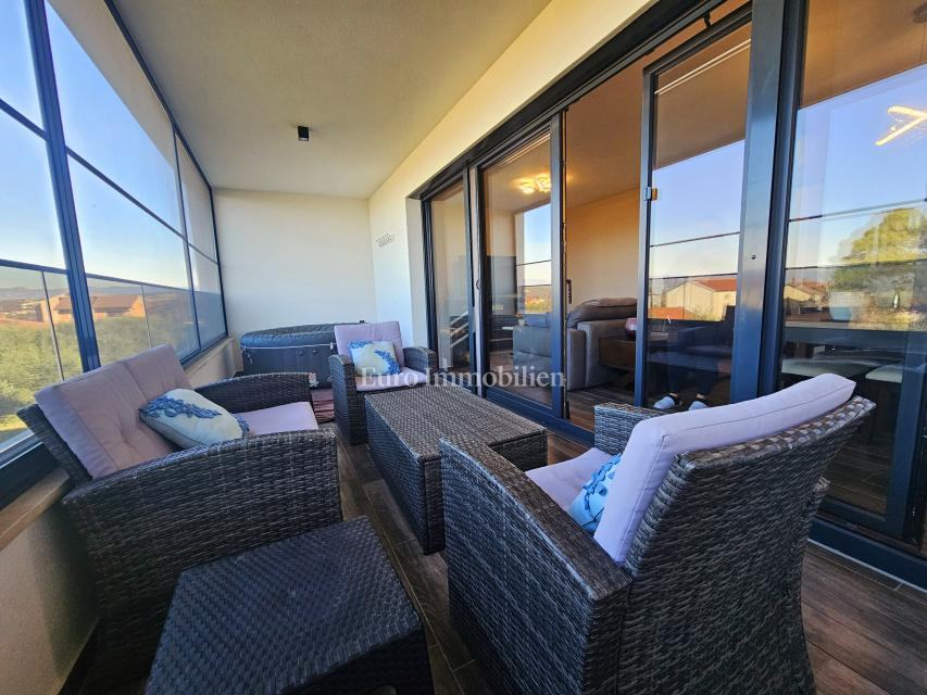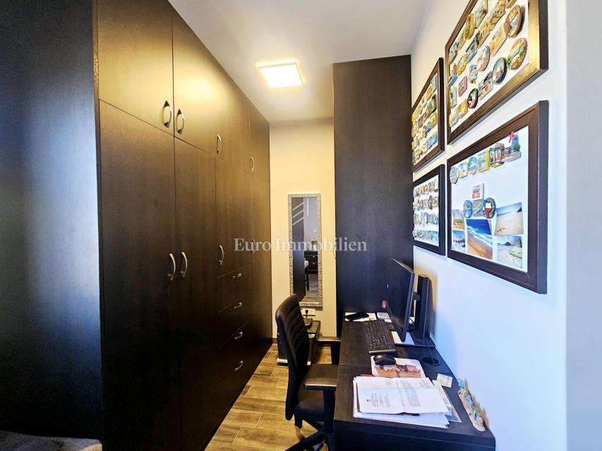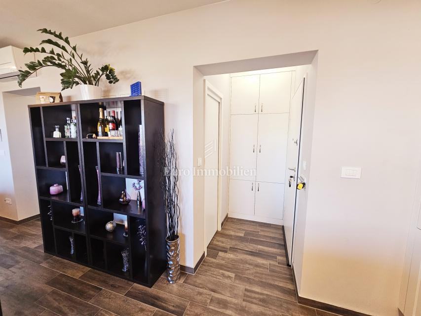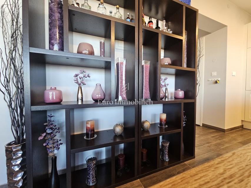 Stan površine 67.22 m² nalazi se na 1. katu, a sastoji se od ulaznog prostora, spremišta, kuhinje s blagovaonom, dnevnog boravka, dvije spavaće sobe i kupaonice. Iz blagovaonce se izlazi na prostranu natkrivenu terasu površine 19 m² koja ima djelomičan pogled na more, a koja služi kao idealno mjesto za uživanje tijekom cijele godine. Podno grijanje postavljeno je u cijelom stanu, a za rashlađivanje služe tri klime.