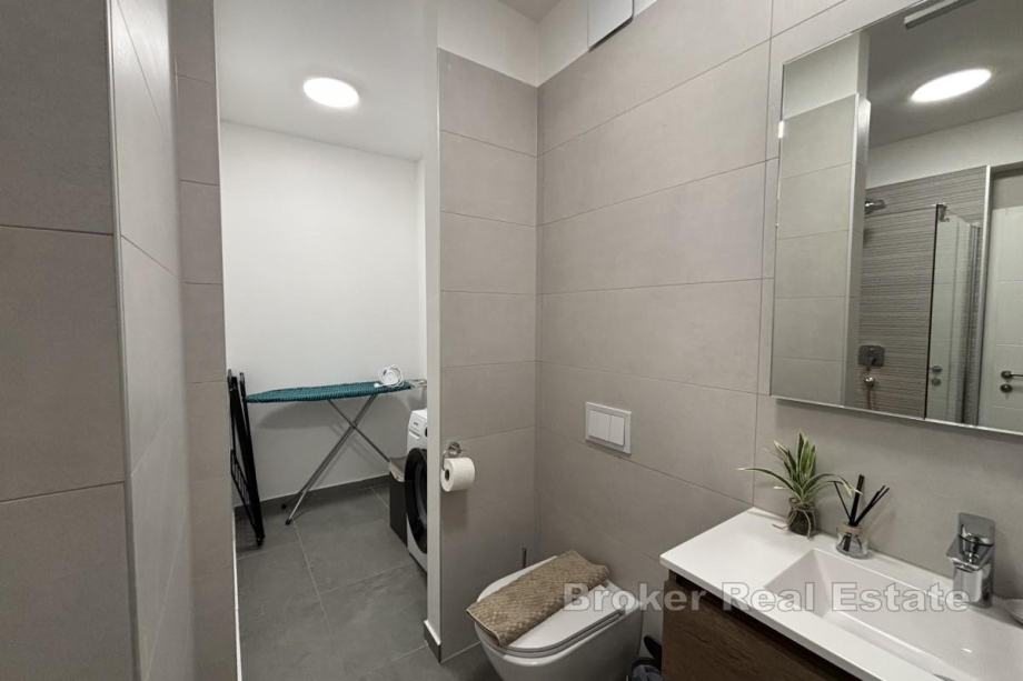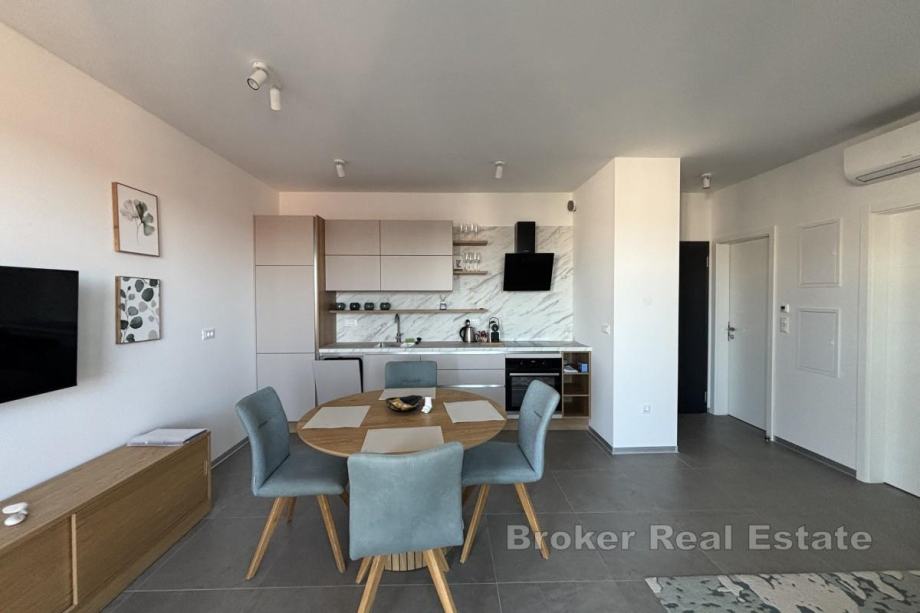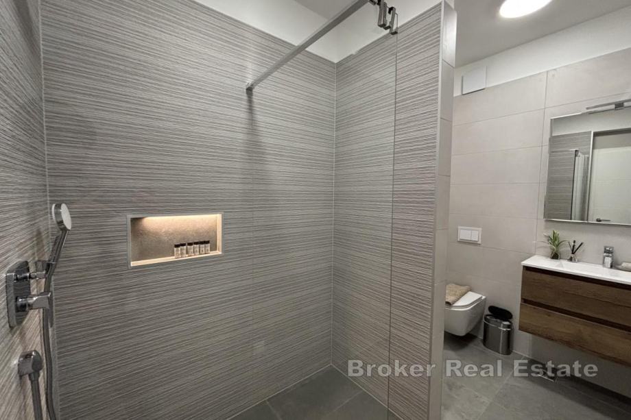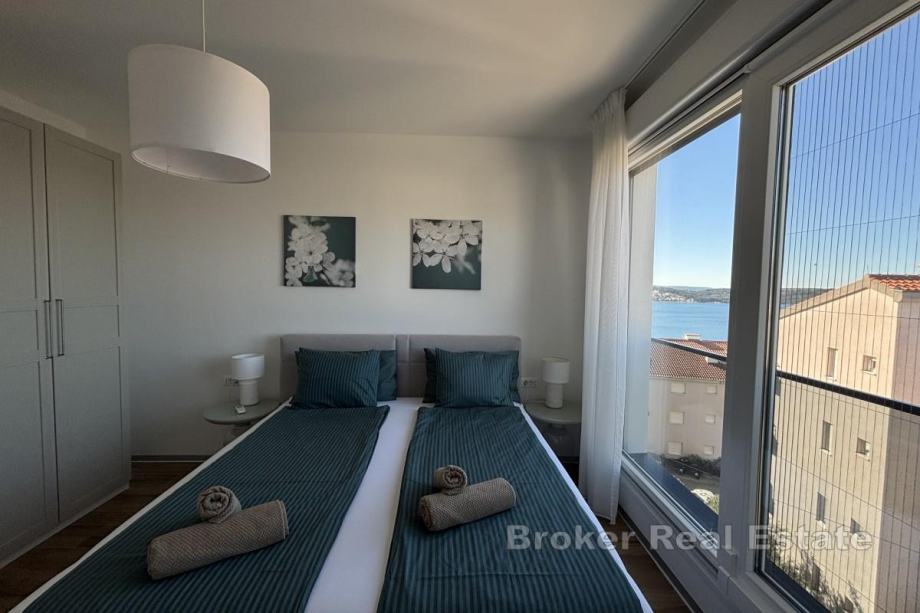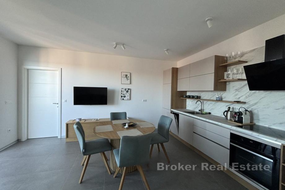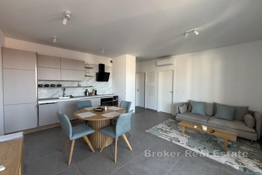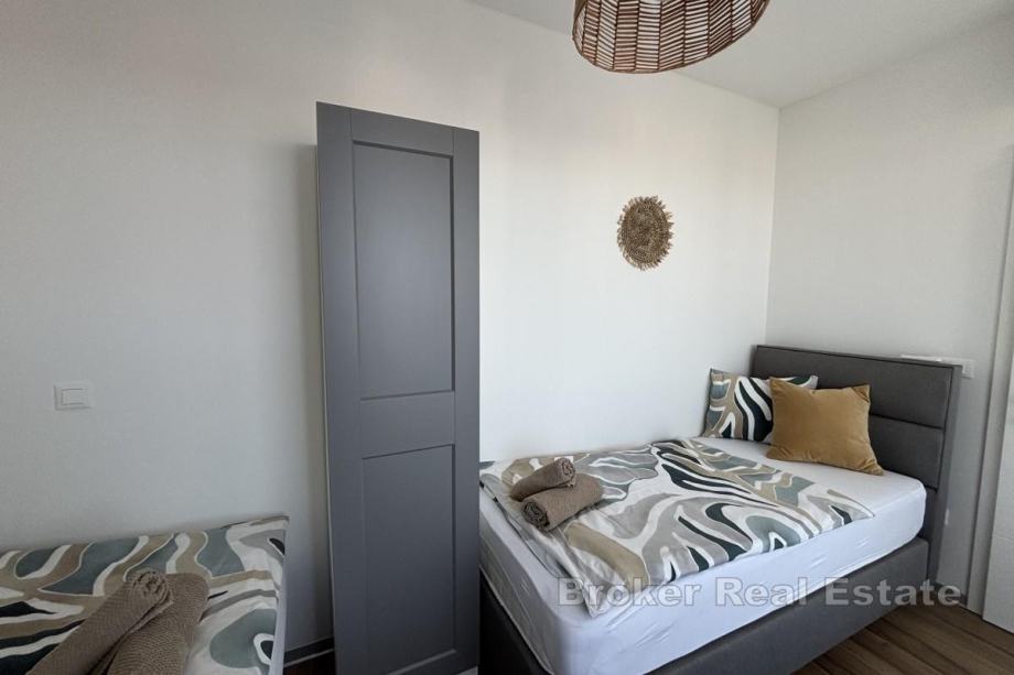 Ima 48,44 m² i sastoji se od hodnika, dvije spavaće sobe, od kojih jedna ima izlaz na balkon od 16,04 m², kupaonice te kuhinje, blagovaonice i dnevnog boravka iz kojeg se izlazi na balkon s otvorenim pogledom na more. Najveća prednost stana je krovna terasa od nekih 106 m², a koja se dijeli sa susjednim penthouse stanom na koju se mogu postaviti različiti sadržaji ovisno o željama kupca. Stan se prodaje u potpunosti namješten i opremljen protuprovalnim vratima, komaricama te električnim podizačima roleta. Grijanje i hlađenje se odvija putem klima uređaja u svakoj prostoriji te podnog grijanja u kupaonici, a u podrumu zgrade se nalazi pripadajuće garažno parkirno mjesto.