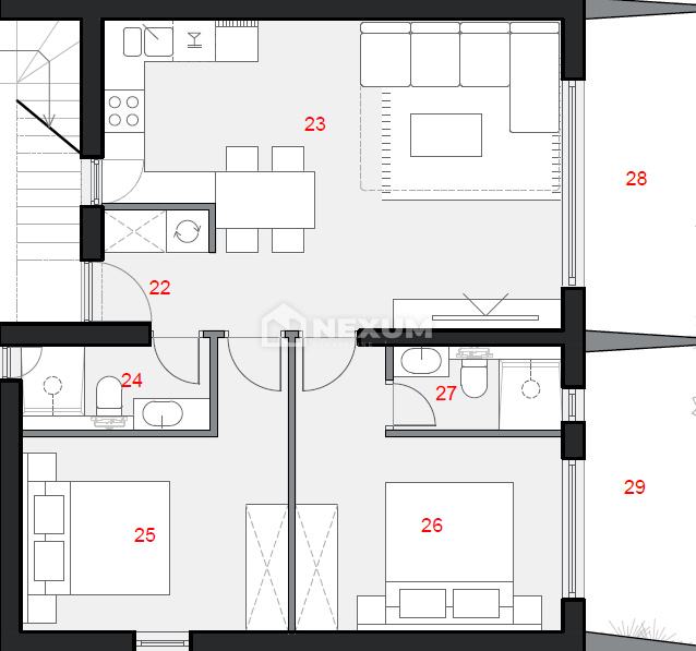 Posredujemo u prodaji dvosobnog stana na prvom katu novogradnje. Ukupna stambena površina iznosi 72,16 m², a sastoji se od dvije spavaće sobe, dvije kupaonice, hodnika, dnevnog boravka s kuhinjom i blagovaonicom te dvije lođe. Jedna od spavaćih soba ima vlastitu kupaonicu i direktan izlaz na lođu.