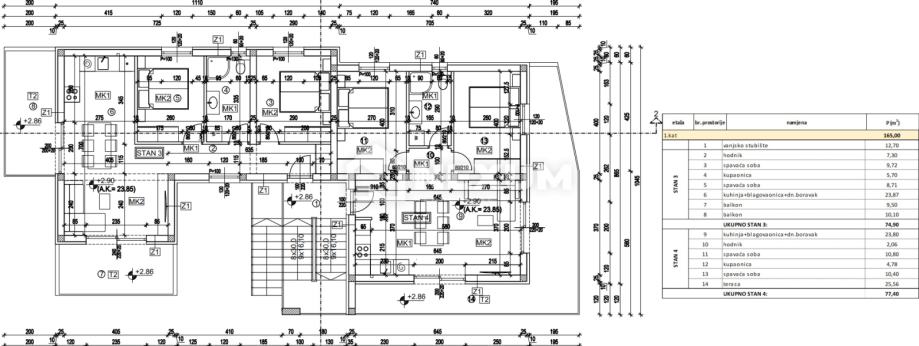 Na prodaju je dvosoban stan S4 na prvom katu zgrade ukupne korisne površine 77,40m2, od čega unutarnji dio stana ima površinu 51,84m2, dok površina terase iznosi 25,56m2.