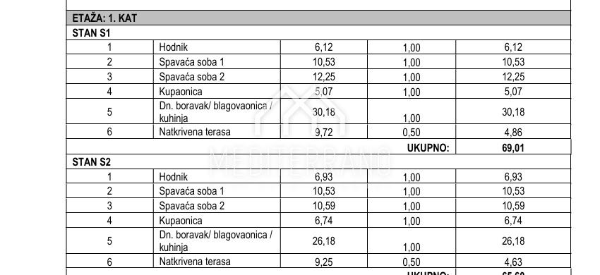 Ukupna stambena površina stana iznosi 59,29 m², a sastoji se od ulaznog hodnika, dvije spavaće sobe, kupaonice te kuhinje s blagovaonicom i dnevnim boravkom. Stanu pripada terasa površine 9,72 m², koja pruža ugodan vanjski prostor za odmor i opuštanje + 2 vanjska parkinga.