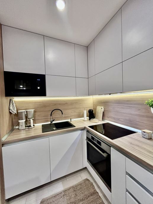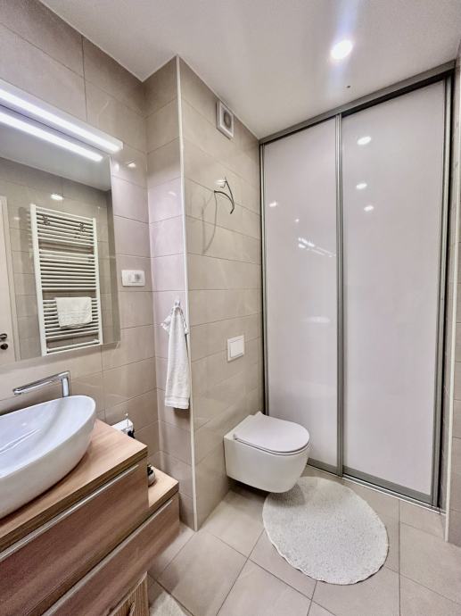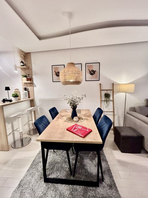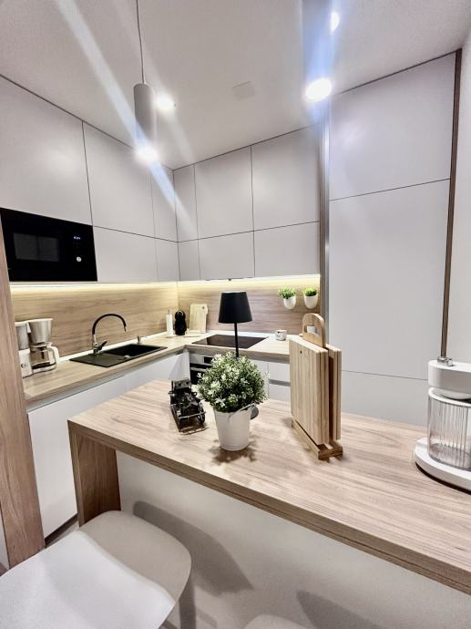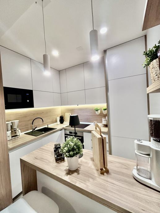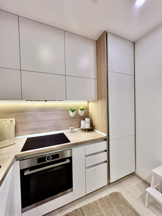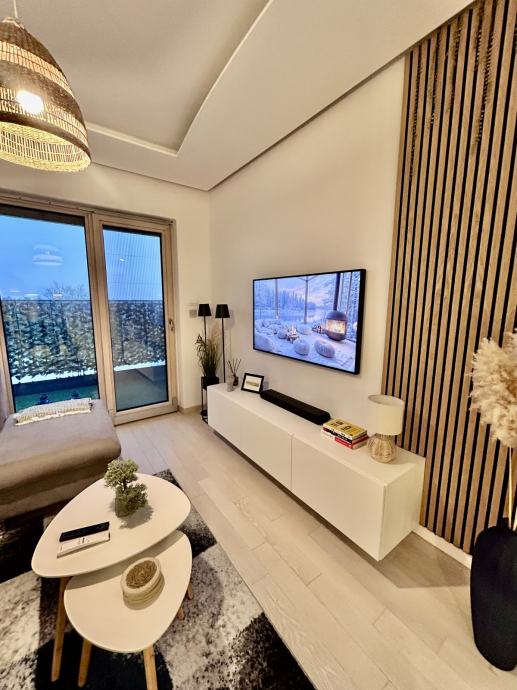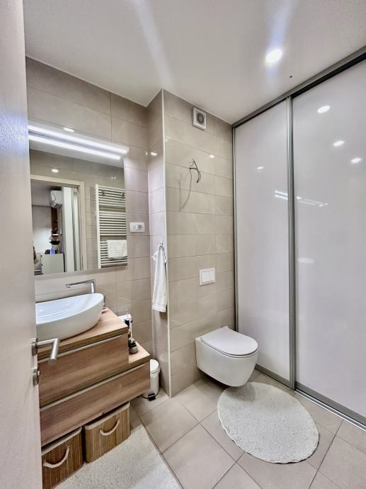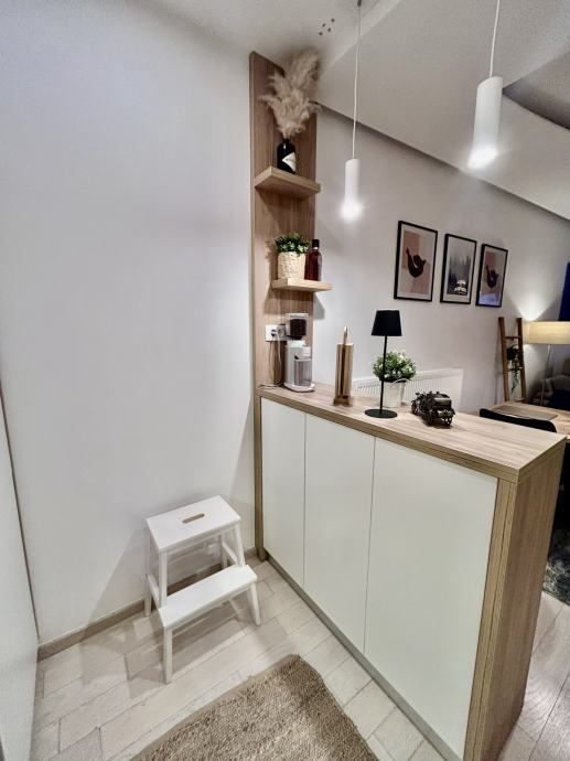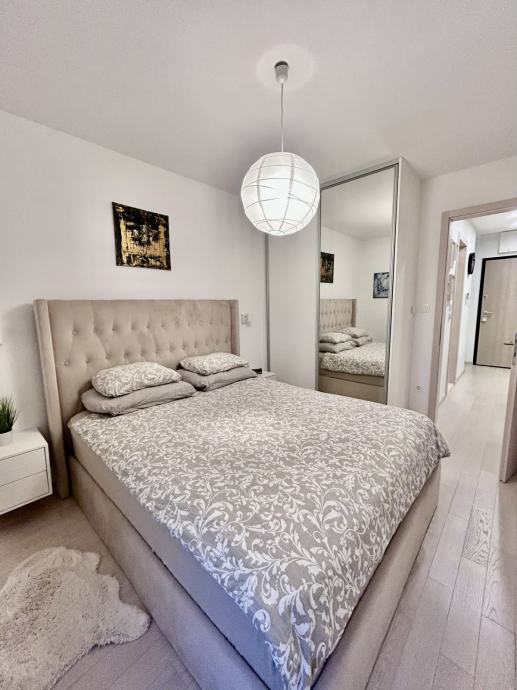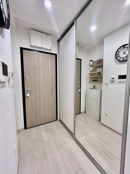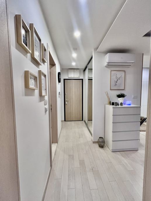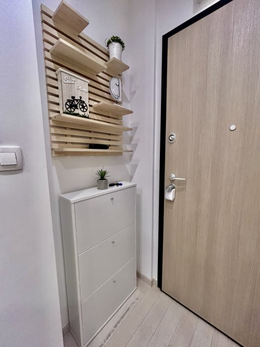 Stan ima vrlo funkcionalan raspored prostorija, opremljen je u potpunosti i vrlo je svjetao i prozračan, a sastoji se od ulaznog hodnika sa masivnim ugradbenim ormarom, kupaonice, spavaće sobe, prostranog dnevnog boravka sa izlazom na natkrivenu lođu, kuhinje i blagovaonice. Kuhinja je je rađena po mjeri sa svim vrlo kvalitetnim ugradbenim kućanskim aparatima, a namještaj je visoke kvalitete.