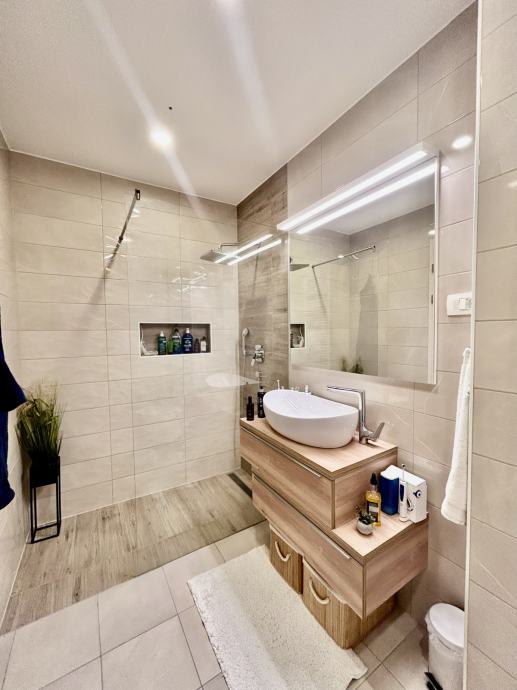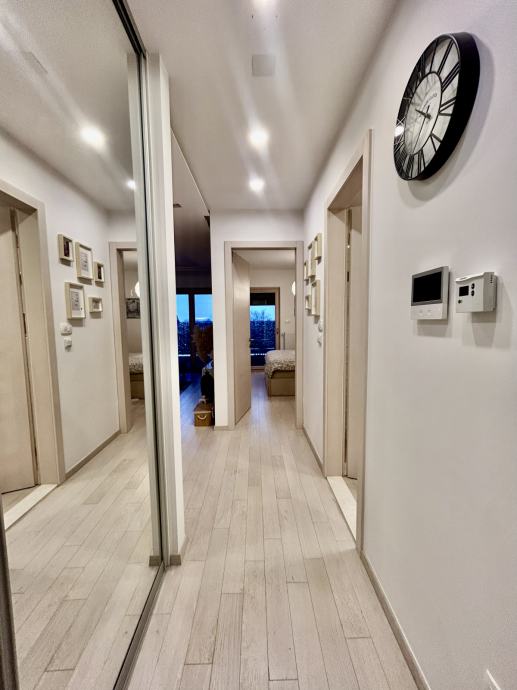 Stan je opremljen vanjskom PVC stolarijom, te ALU-DRVO stolarijom (izbjeljeni jasen), podovi su izvedeni visokokvalitetnim laminatom i keramičkim pločicama, a u kupaonici i lođi je izvedeno podno grijanje, stropovi su spušteni, te dodatno izolirani. Stan je opremljen ugradbenim ormarima u hodniku i kupaonici,