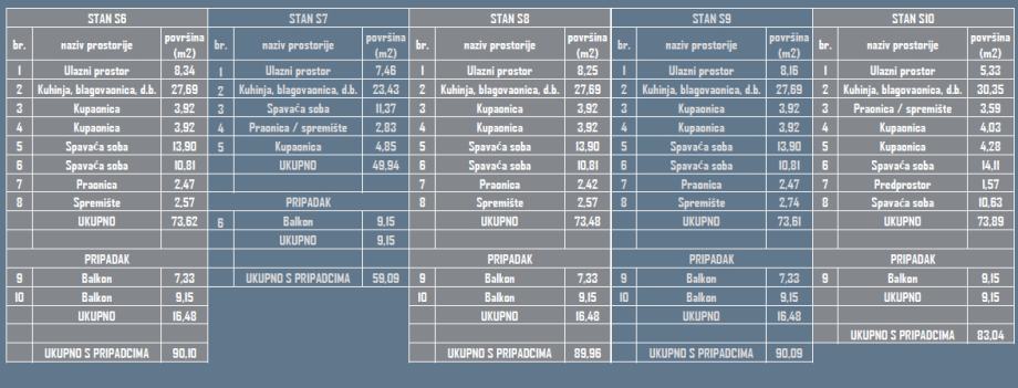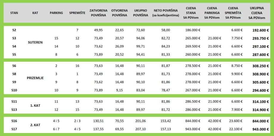 STAN/ PARKING / SPREMIŠTE / UKUPNO POVRŠINA / UKUPNA CIJENA