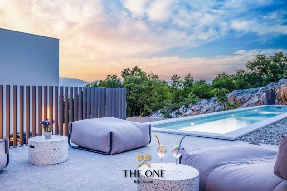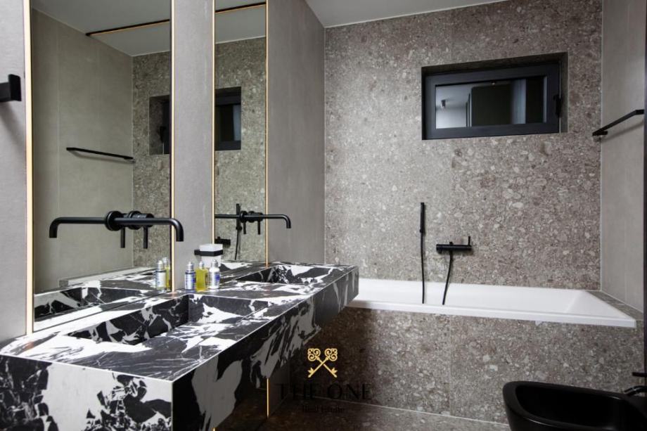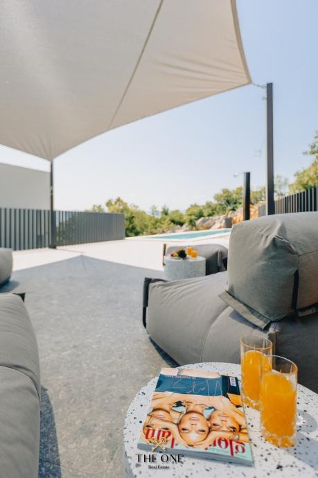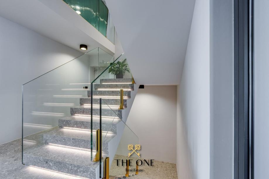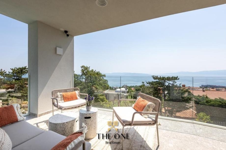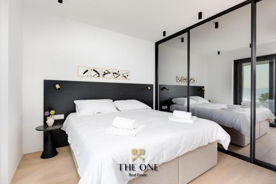 Staklena vrata ujedno nesmetano povezuju unutarnji prostor s natkrivenom terasom, na kojoj se nalazi sjedeća garnitura. S terase se pruža panoramski pogled na okolinu i more. Stan ima dvije spavaće sobu i dvije kupaonice.