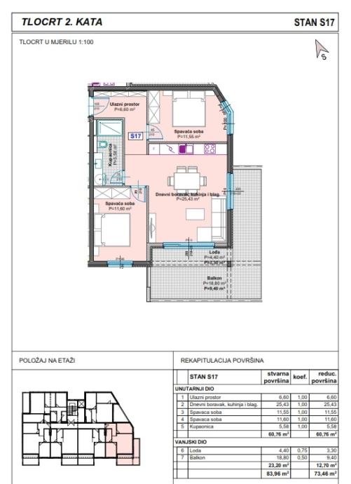 Stan je oznake S17 ukupne površine 73,46m2, a sastoji se od ulaznog prostora, dvije spavaće sobe, kupaonice, dnevnog boravka, kuhinje i blagovaonice te prostrane lođe i balkona sa prekrasnim pogledom na more.