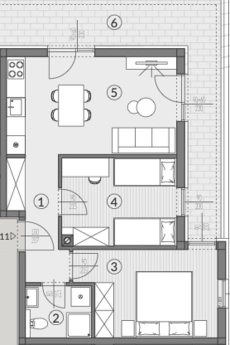 Stan oznake A11, ukupne površine 61,12 m², sastoji se od ulaznog hodnika s garderobom, dvije spavaće sobe, kupaonice, te dnevnog prostora s kuhinjom i blagovaonicom. Iz dnevnog dijela izlazi se na natkrivenu terasu. U cijenu su uključena dva parkirna mjesta.