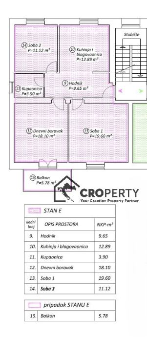 Ukupna neto površina stana s balkonom iznosi 81,04 m², a sastoji se od: