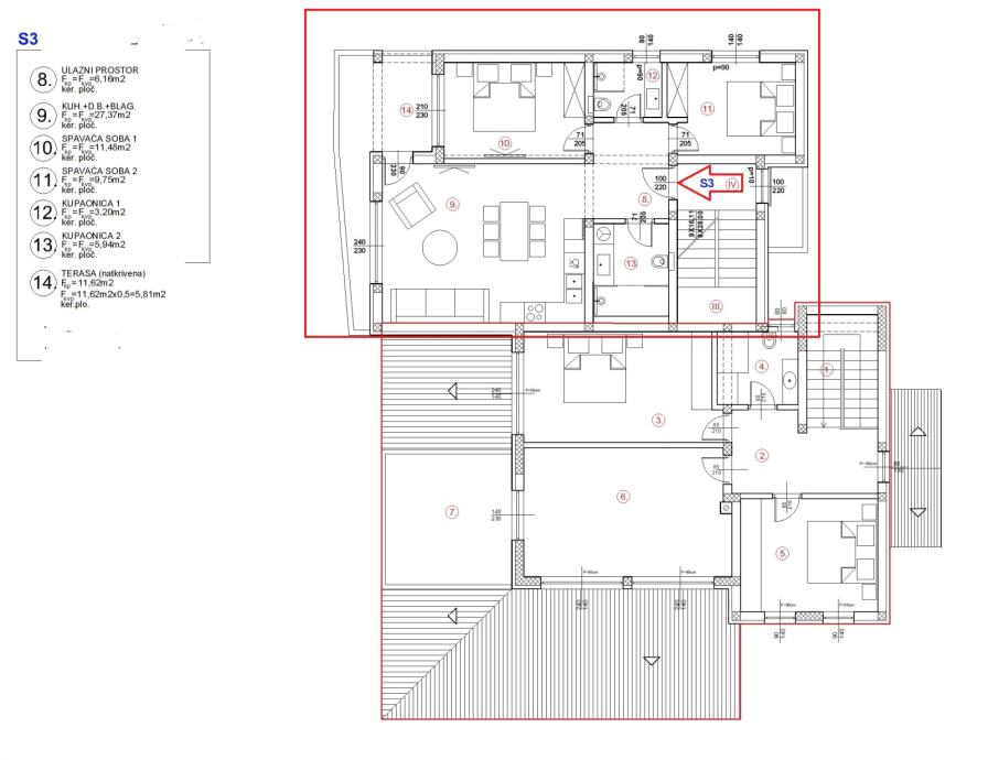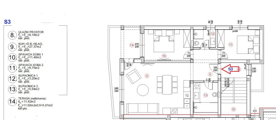 STAN S3 na I katu, netto površine 72,21 m2 koji se sastoji od predsoblja, kupaonica 1, kupaonica 2 , spavaća soba 1, spavaća soba 2, dnevni boravak sa kuhinjom i blagovaonom, terasa, te pripadak 1 parkirno mjesto ispred zgrade, = 230.000,00 €