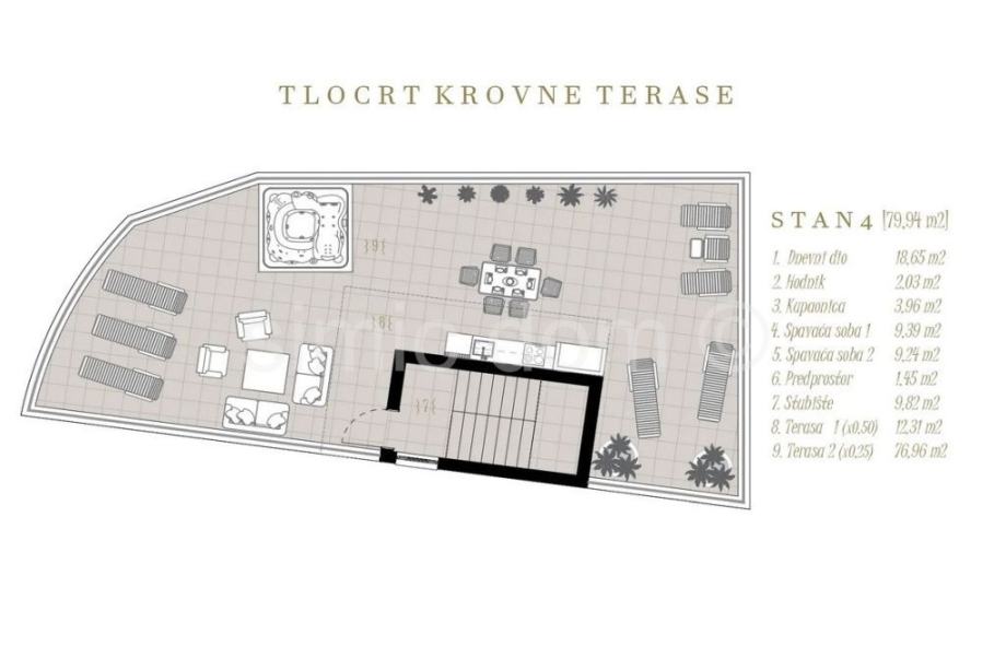 Posredujemo u prodaji vrlo kvalitetnog i prostranog stana na mirnoj lokaciji u Podstrani. Obračunska je površina stana 79,94m2 te se nalazi na drugom katu manje zgrade sa samo 5 jedinica, jamčeći tako mir i privatnost. Stan se sastoji od dvije spavaće sobe, kupaonice, velikog dnevnog boravka s kuhinjom i blagovaonicom, a stanu pripada i impozantna krovna terasa s koje se pruža nevjerojatan pogled na more, otoke i cijelo okolno područje. Izgradnja započinje u rano proljeće 2026. pa se završetak očekuje u rano ljeto 2027. godine. Sama je izgradnja izvrsno isplanirana te će zgrada biti vrhunske kvalitete: provjerena klimatizacija, izolacija, kupaonska oprema prve klase… Posebno ističemo kako je u cijeni stana i garažno parkirno mjesto kao i manja ostava, a s obzirom da je investitor pravna osoba, nema obveze plaćanja 3% poreza na promet nekretninama. Vlasništvo uredno.