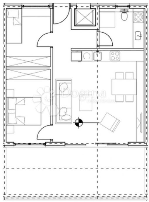 Sastoji se od dvije spavaće sobe (10,73m2 i 6,32m2), ulaza (4,24m2), kupaonice (5,14m2) te raskošnog otvorenog prostora kuhinje, blagavaonice i dnevnog boravka (26,70m2) s koje imamo direktan izlaz na terasu površine čak 23m2 s koje se pruža kako smo već i naveli, jedan od najboljih pogleda u gradu!