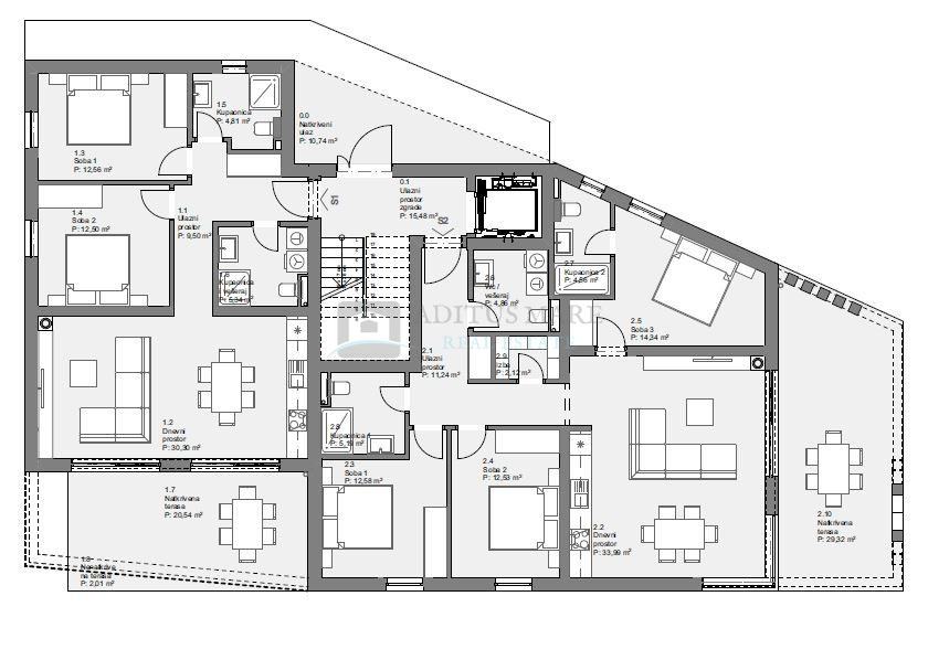 Sastoji se od ulaznog prostora (9.50 m2), dnevnog prostora (30.30 m2) s izlazom na prostranu natkrivenu terasu (20.54 m2), dvije spavaće sobe (12.50 m2 i 12.56 m2), dvije kupaonice (4.81 m2 i 5.34 m2) i nenatkrivene terase (2.01 m2).