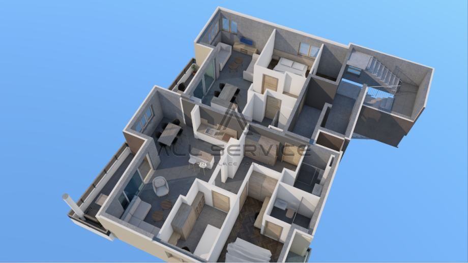 Sastoji se od dvije spavaće sobe, predsoblja, dvije kupaonice, dnevnog dijela s kuhinjom i blagovaonicom, te dvije loggie.