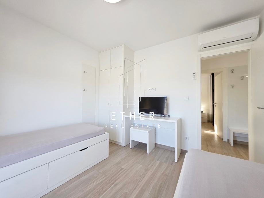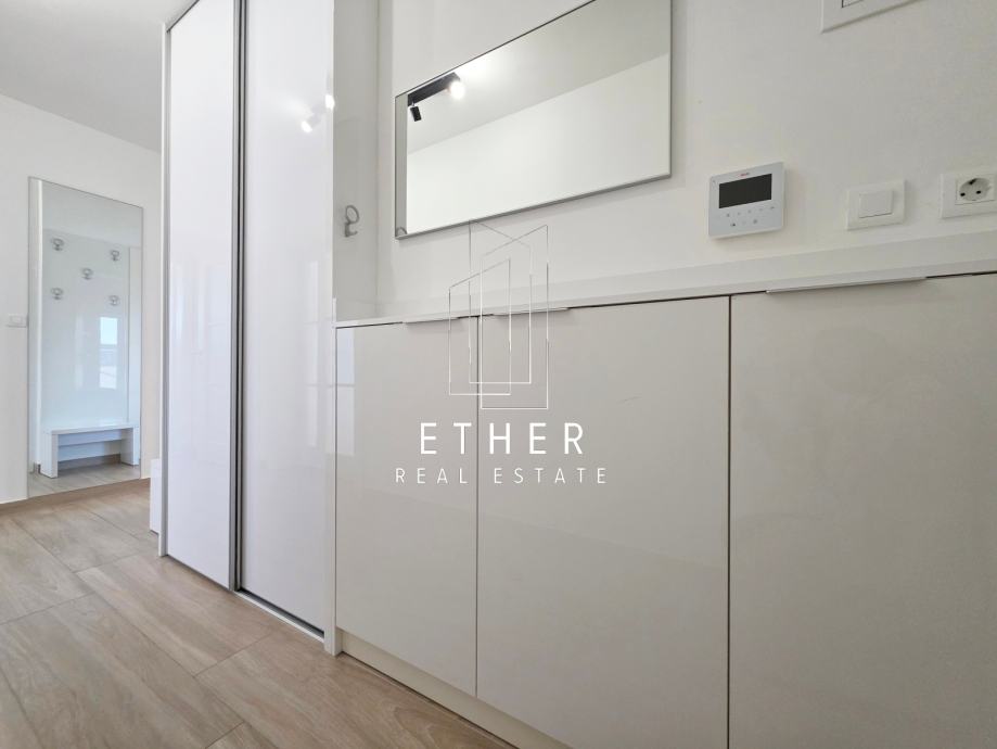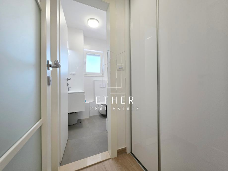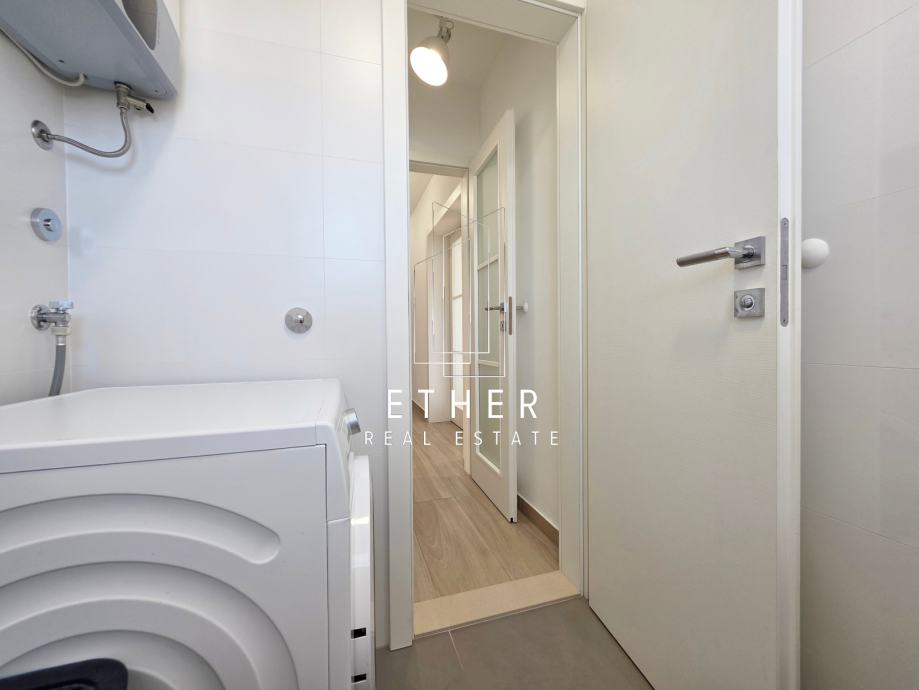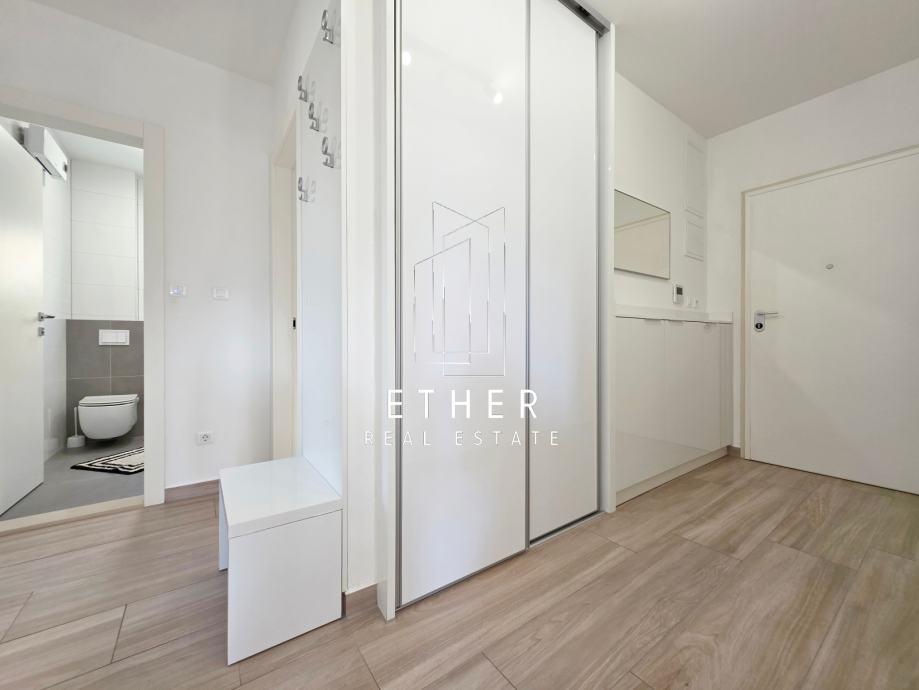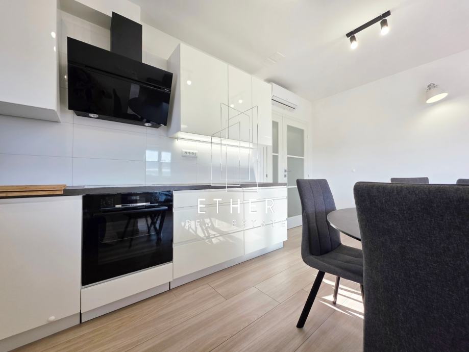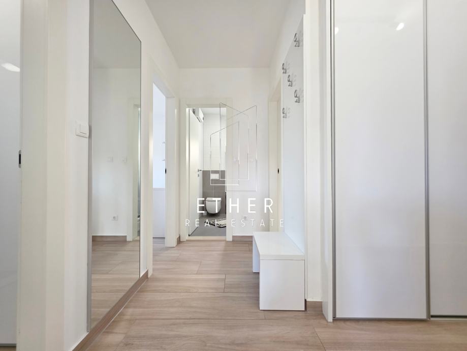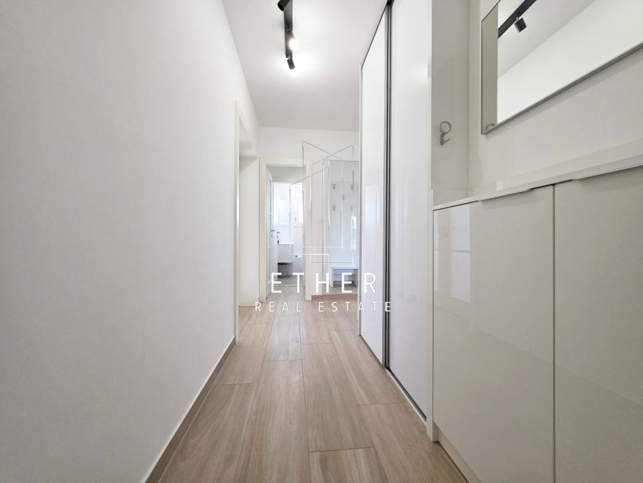 It consists of an entrance hall with built-in wardrobes, kitchen with dining room and living area, two bedrooms, two balconies, bathroom and an additional small toilet. The apartment is especially valuable due to its two balconies - one bedroom has direct access to the balcony, while the kitchen with a dining room and a living room also leads to a second balcony, providing an additional feeling of airiness and comfort.