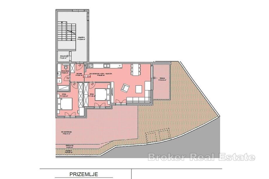 Na prodaju je stan površine 95 kvadrata, smješten u prizemlju moderne novogradnje s liftom. Stan se sastoji od dvije spavaće sobe, prostranog dnevnog boravka povezanog s kuhinjom i blagovaonicom, kupaonice te lođe koja pruža ugodan prostor za opuštanje. Iz dnevnog dijela izlazi se na vanjsku nenatkrivenu terasu okruženu zelenilom, koja stanu daje poseban osjećaj privatnosti i mirnoće.