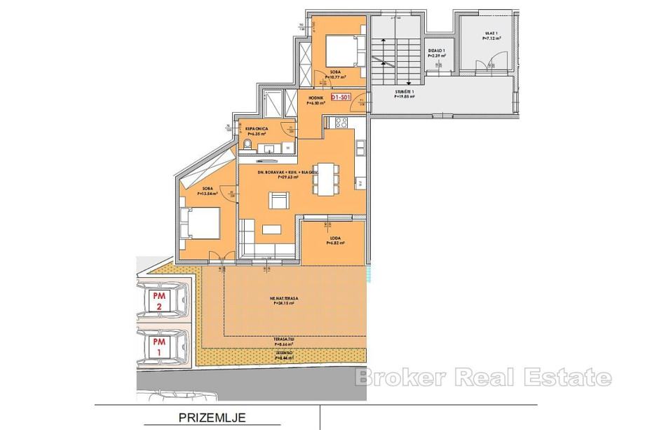 Na prodaju je stan površine 80 kvadrata, smješten u prizemlju moderne novogradnje s liftom. Stan se sastoji od dvije udobne spavaće sobe, prostranog dnevnog boravka povezanog s kuhinjom i blagovaonicom, kupaonice te lođe koja pruža ugodan prostor za opuštanje. Iz dnevnog dijela izlazi se na vanjsku nenatkrivenu terasu okruženu zelenilom, koja stanu daje poseban osjećaj privatnosti i mirnoće.