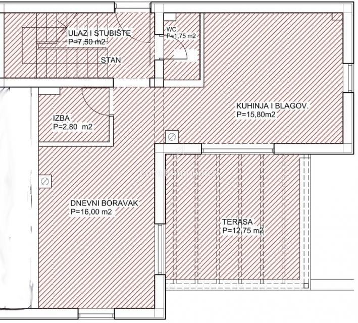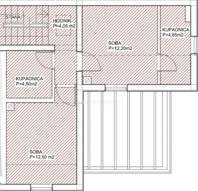 Dvoetažni stan u stambenoj zgradi ukupne površine 99,45 m² (NKP 87,05 m²), raspoređen na dvije etaže.