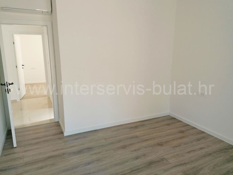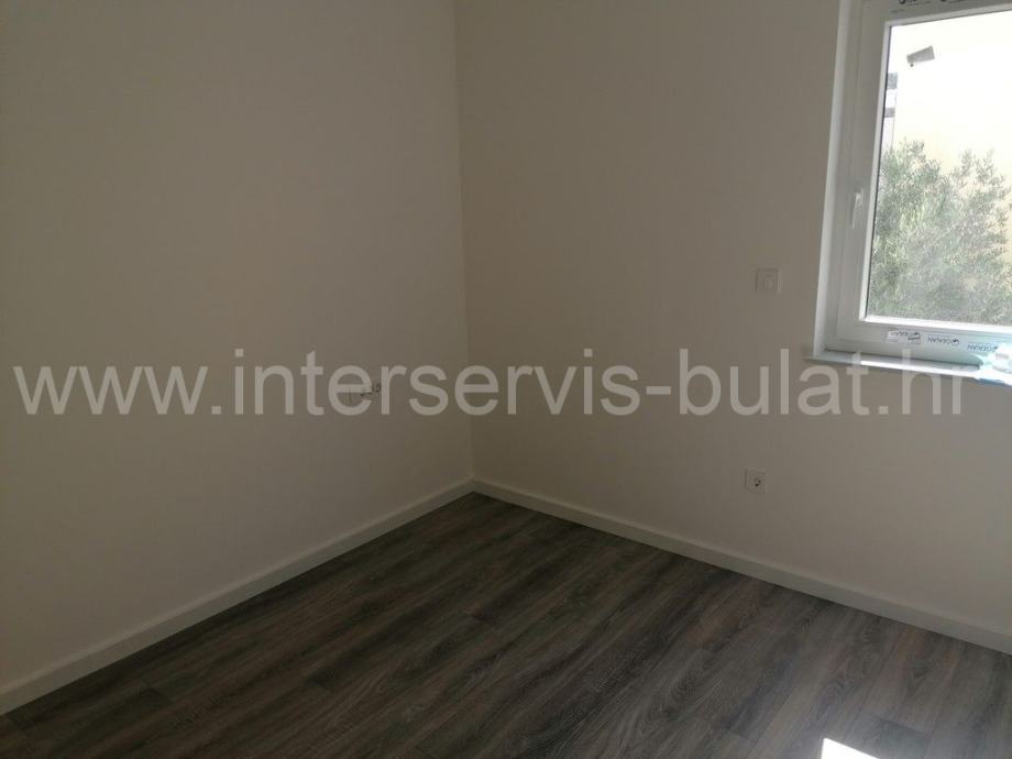 Na mirnijoj lokaciji u Vodicama nalazi se zgrada sa tri etaže i po jednim stanom na svakoj etaži. Predmetni stan se nalazi na drugom katu i raspolaže sa 89m2 korisne površine. Sastoji se od hodnika, toaleta, kupaonice, kuhinje sa blagovaonicom i dnevnim boravkom, dvije spavaće sobe i izlazom na dvije terase. Stan je opremljen komarnicima, električnim roletama, klimama u svim prostorijama, podnim grijanjem u kupaonici, kuhinji i dnevnom boravku. Zgrada je kvalitetno građena, a podloge i sanitarije su od vrhunskih materijala. Stanu također pripadaju i dva parkirna mjesta.