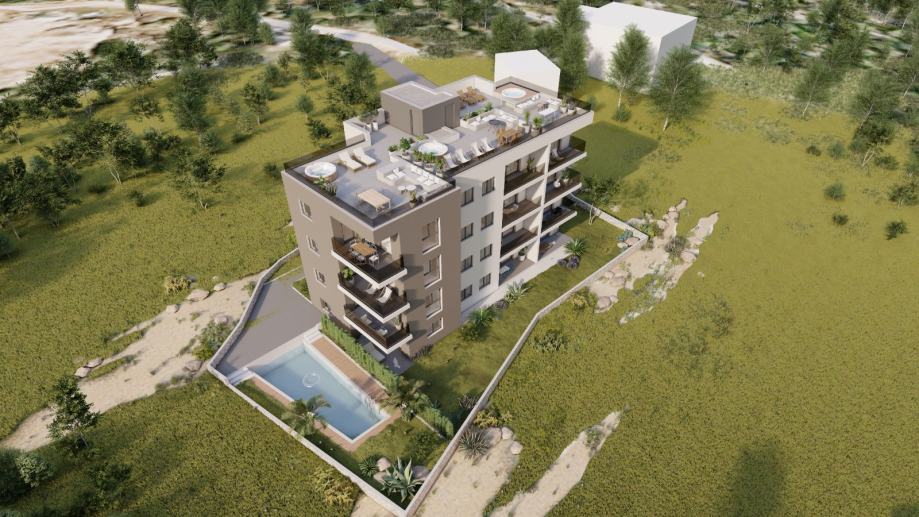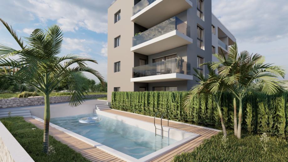 Zgrada je okružena uređenim vrtom i parking mjestima te ima lift i zajednički bazen.