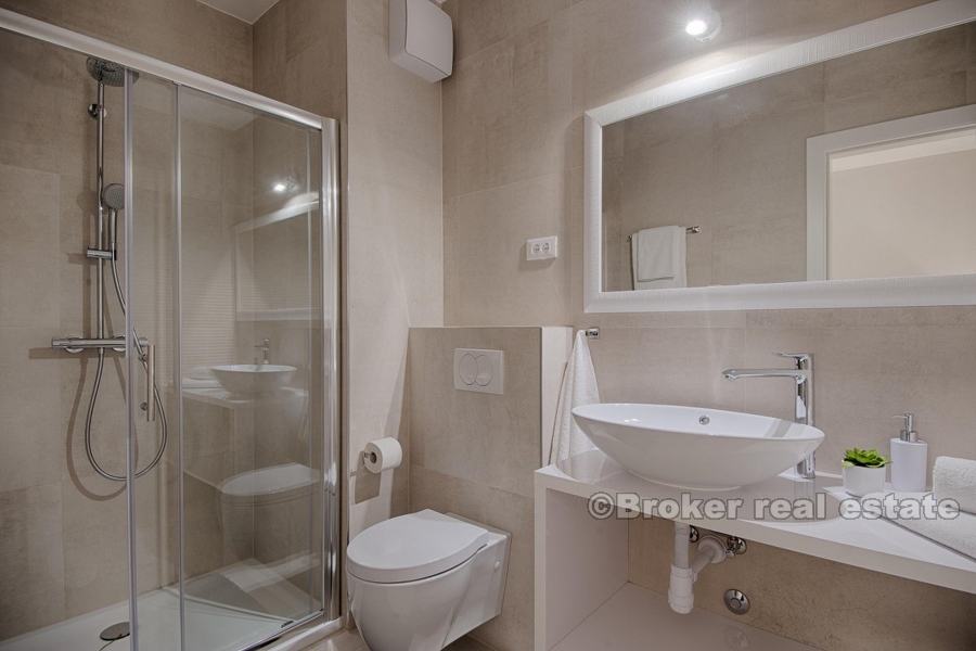 Prekrasan, moderno uređen apartman s očaravajućim pogledom na more i dalmatinske otoke. Prostire se na 80 m2 i sastoji se od dvije spavaće sobe, dvije kupaonice, jednog wc-a, prostranog dnevnog boravka te kuhinje s blagovaonicom. Glavna prednost je veliki balkon s pripadajućom sjedećom garniturom, gdje možete uživati veći dio godine. Stan je kompletno i luksuzno opremljen. Pripada mu i parkirno mjesto u garaži, odakle se direktno liftom dolazi u stan. Stan je južne orijentacije, u blizini plaže Žnjan, šetnice, restorana, dućana te ostalih bitnih sadržaja.