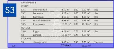 Podno grijanje u cijelom stanu. Neto površina stana iznosi 63 m2, dok bruto površina stana iznosi 77,56 m2.