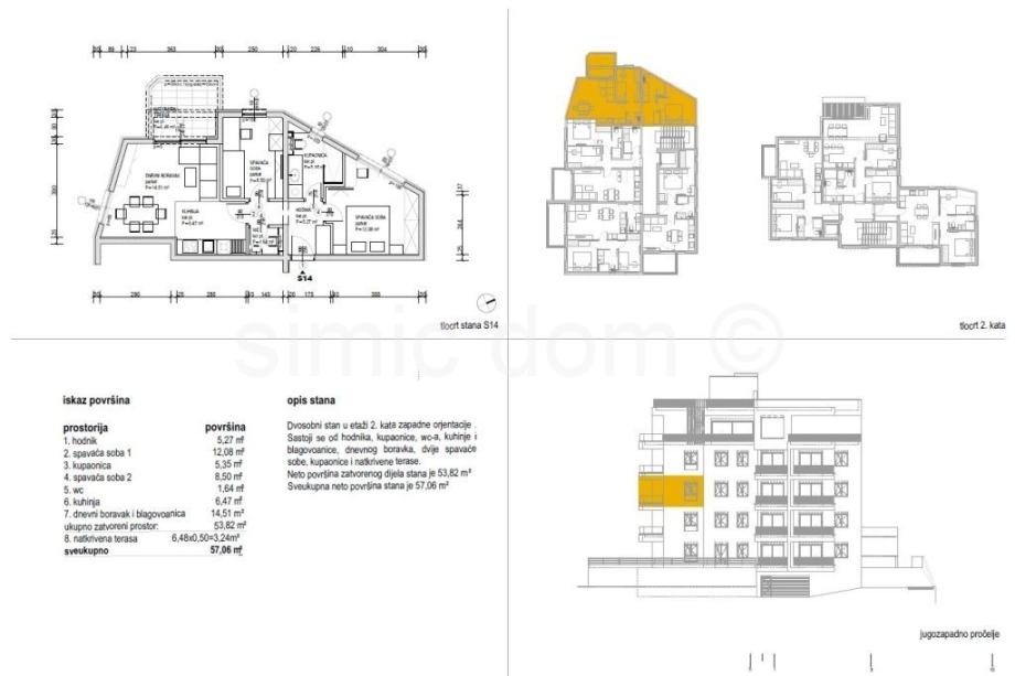 Posredujemo u prodaji vrlo atraktivnog stana na mirnoj lokaciji u manjem mjestu pored Omiša. Stan se nalazi na drugom katu zgrade koja ima ukupno pet etaža (prizemlje te četiri gornja kata). Neto korisna površina stana je 57,07 m2 te se sastoji od hodnika, dviju spavaćih soba, kupaonice, dodatnog toaleta te kuhinje s dnevnim boravkom. Tu je i prekrasna natkrivena terasa s koje se pruža divan pogled na more. Pored vrhunske opremljenosti zgrade i izbora najkvalitetnijih materijala (podno grijanje u kupaonicama, klima uređaji u spavaćim sobama i dnevnom boravku, pomno odabrana keramika, stolarija i vrata), zgradu odlikuje i vrlo moderan i funkcionalan dizajn. S obzirom da je investitor pravna osoba, nema poreza od 3% na promet nekretninama. Unutar desetak minuta šetnje su svi nužni sadržaji poput trgovina ili plaže, a završetak je planiran za jesen 2026. Vlasništvo uredno.