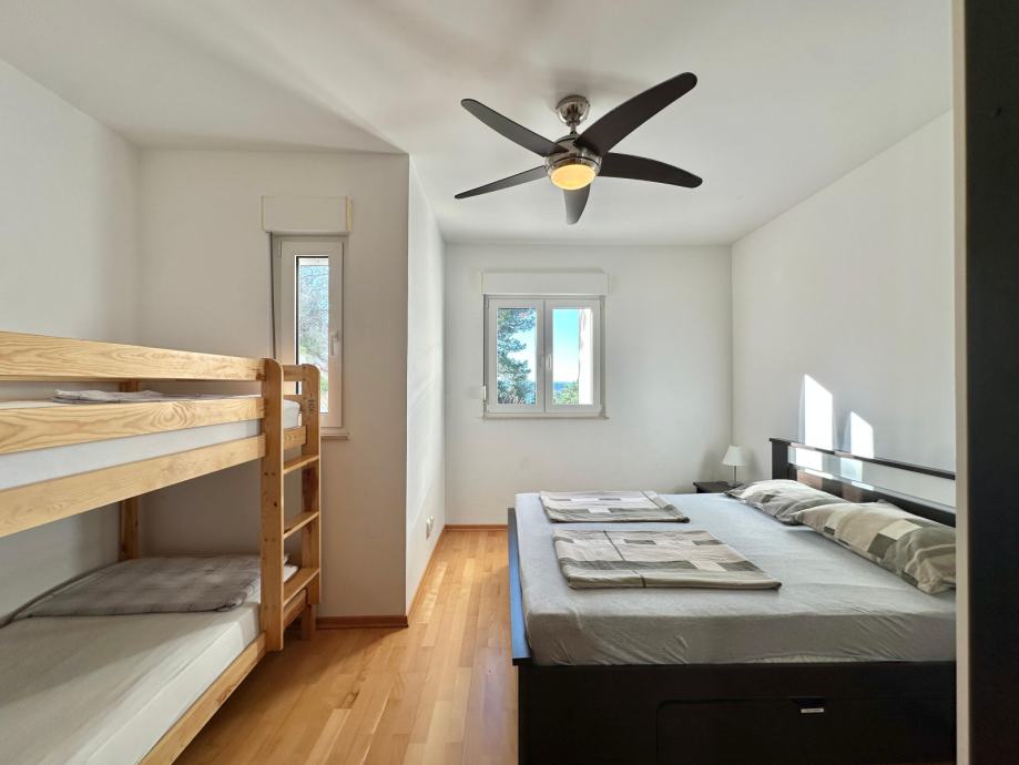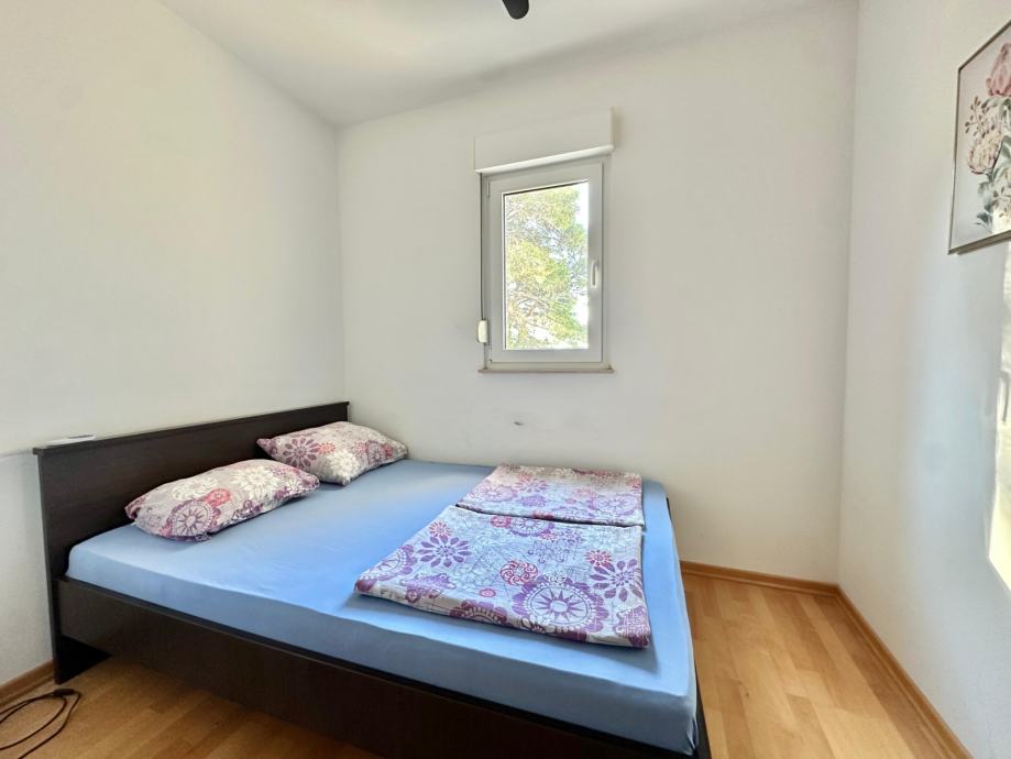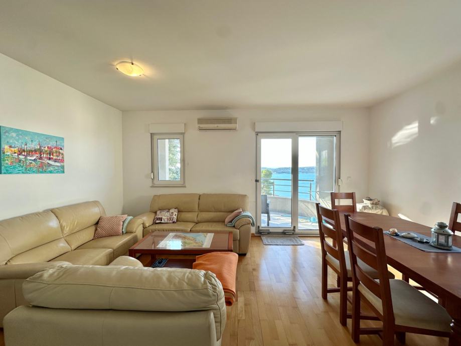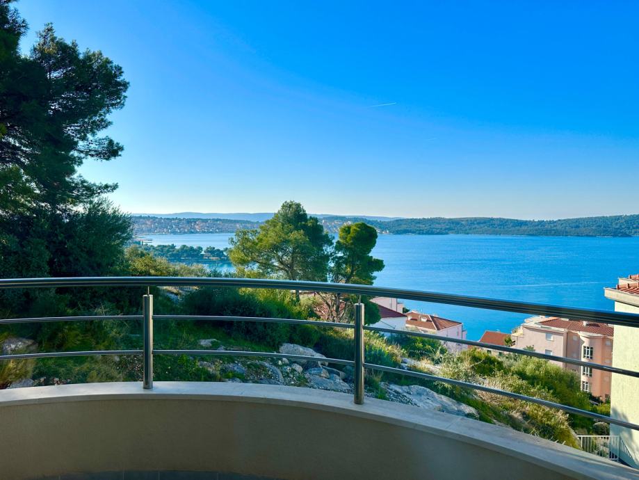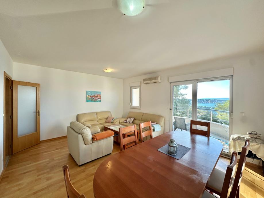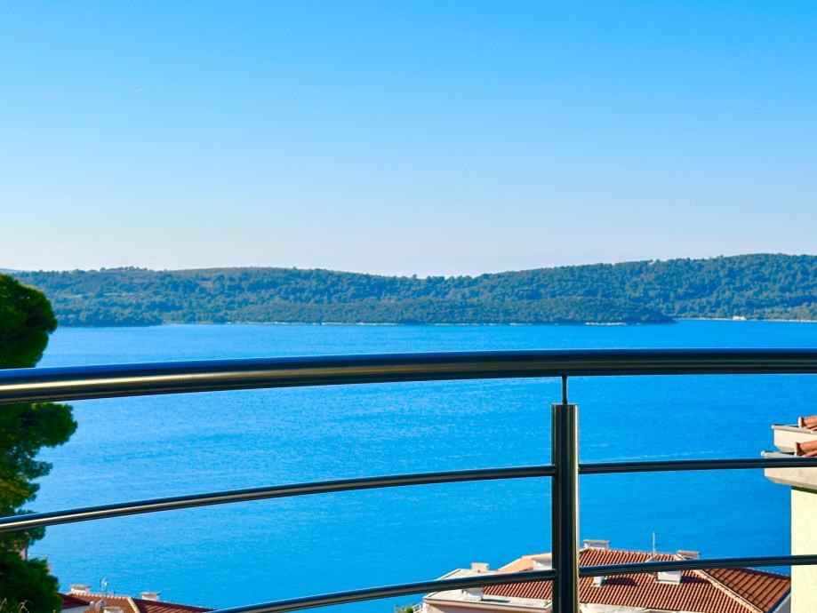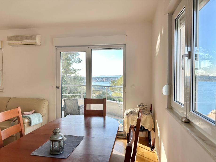 A two-bedroom apartment is for sale on the island of Čiovo in Trogir, offering a beautiful panoramic view of the sea, ideal for living in a peaceful Mediterranean setting. The apartment is fully furnished and has exceptional potential.