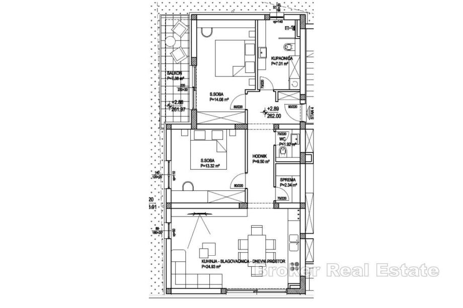 Stan se sastoji od kuhinje s blagovaonicom, spreme, kupaonice i dodatnog wc-a, dvije spavaće sobe i dva balkona. Opremljen je podnim grijanjem u kupaonici, Geberit ugradbenim vodokotlićem i ugradbenim tušem. Orijentiran je prema jugozapadu, što osigurava obilje prirodnog svjetla tijekom cijelog dana. Lokacija je izuzetno praktična – mirna i okružena prirodom, ali istovremeno vrlo blizu grada, mora i svih potrebnih sadržaja.