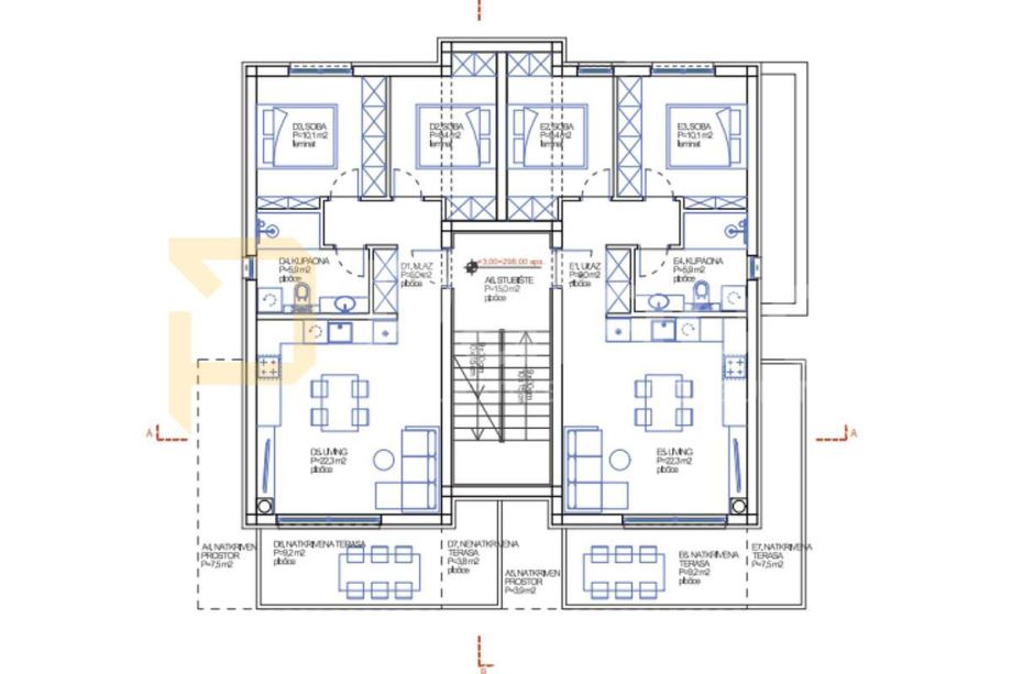 Površina stana: 2 spavaće sobe + kuhinja + dnevni boravak, kupaonica