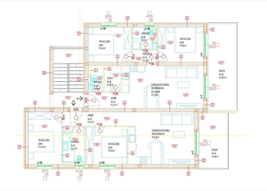 - kuhinja/blagovaonica/dnevni boravak ker.pl./parket P= 21,86 m2