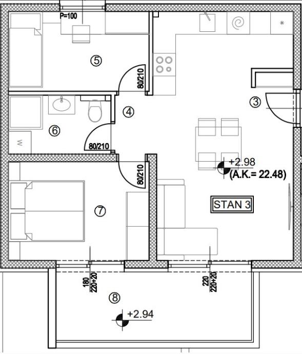 Sastoji se od dvije spavaće sobe, kupaonice, predsoblja, kuhinje s blagovaonicom i dnevnim boravkom i balkona.