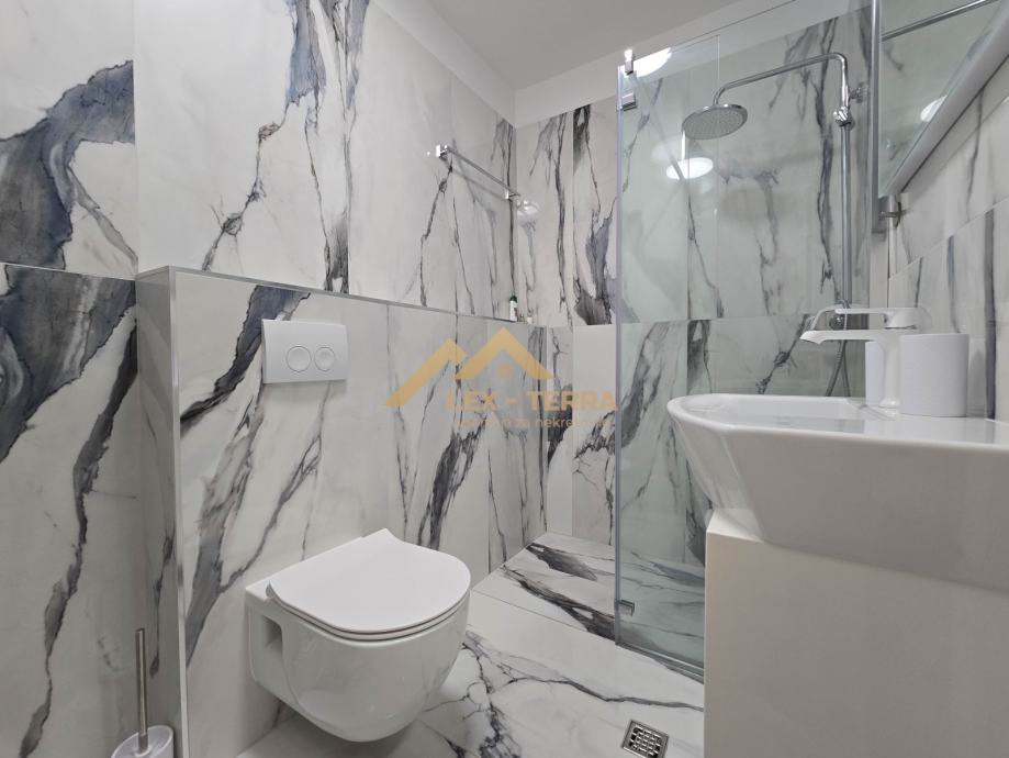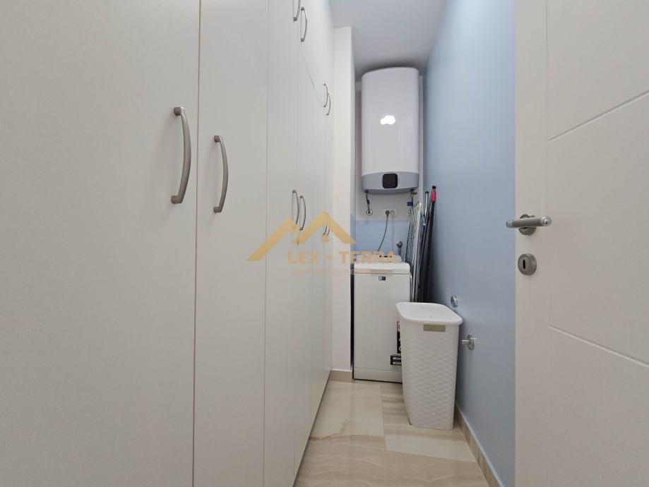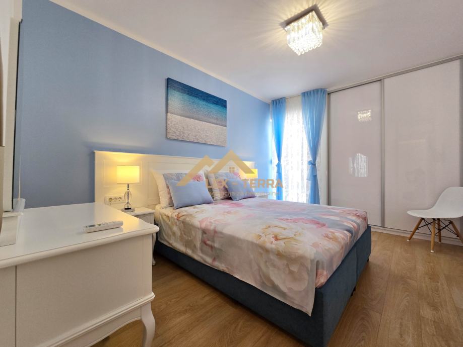 Opremljen je svim potrebnim uređajima i namještajem, uključujući TV, klima uređaj, perilicu rublja i perilicu posuđa. Stan je klimatiziran, ima uveden internet i podno grijanje u cijelom prostoru, što pruža dodatnu udobnost.