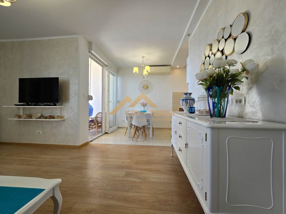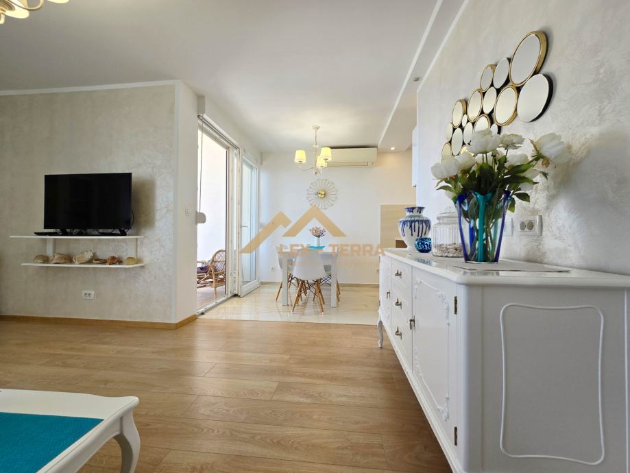 The apartment consists of an entrance area, a spacious kitchen with a dining room and a living room, a hallway, two bedrooms, a storage room, two bathrooms and a loggia with a beautiful view of the sea.